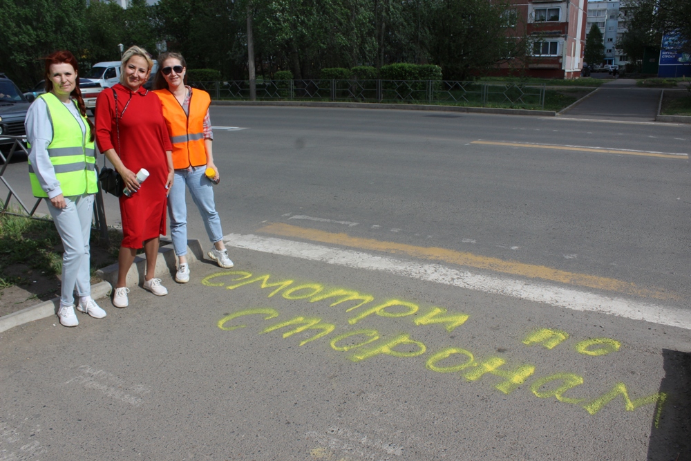 Перед пешеходным переходом, который находится вблизи одной из школ, и с помощью красок активистки нанесли призывающие надписи «Будь внимателен», «Смотри по сторонам».