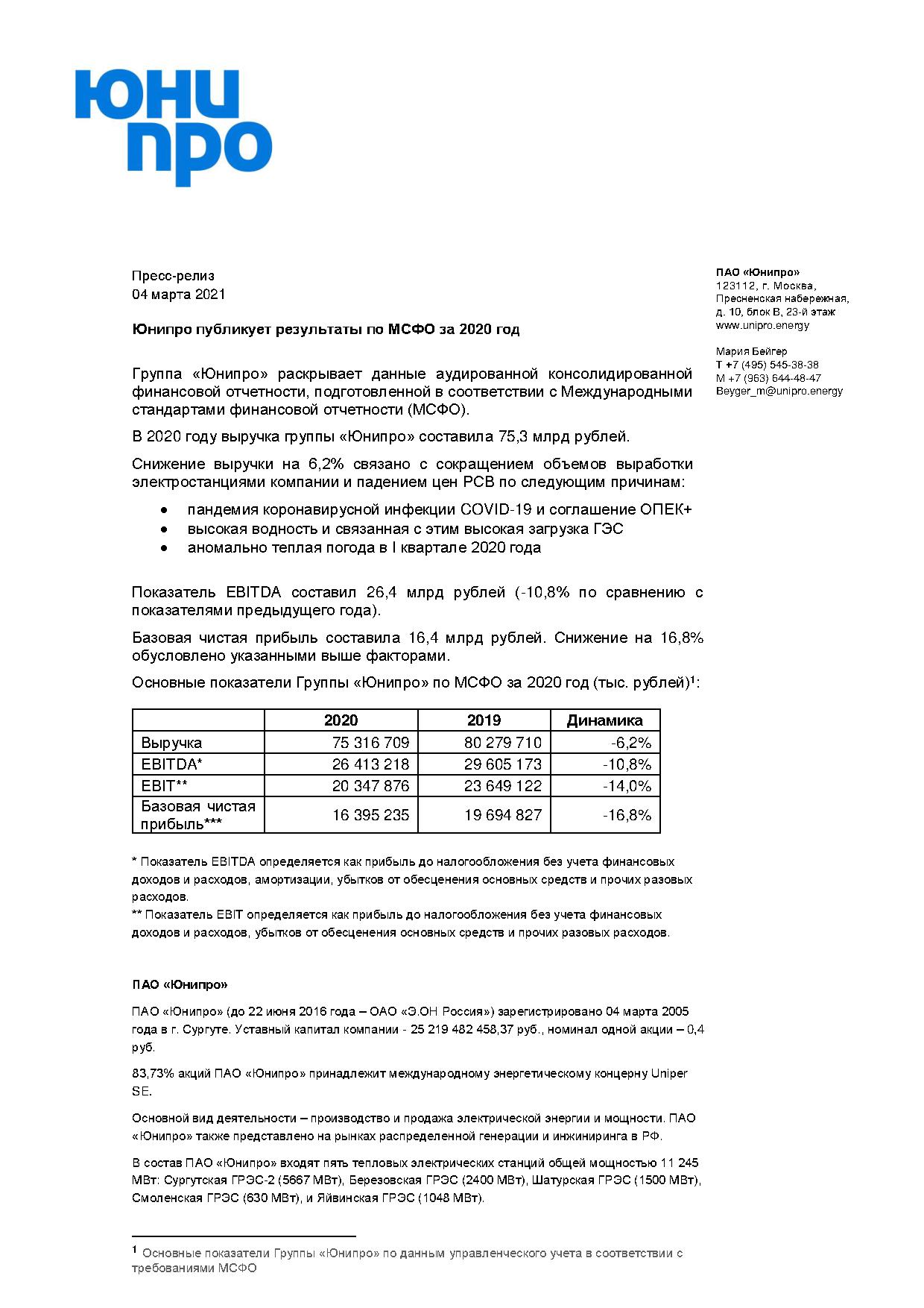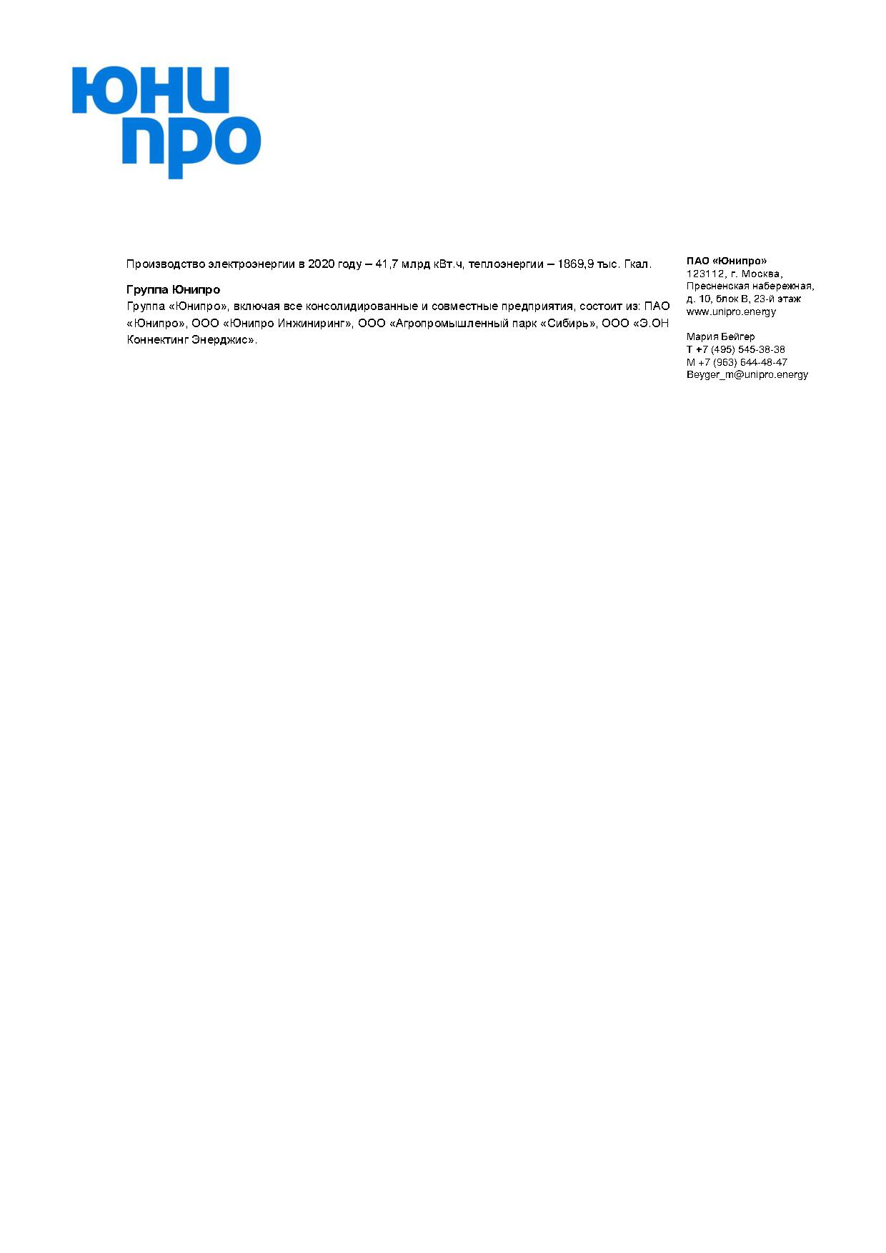 Юнипро публикует результаты по МСФО за 2020 год