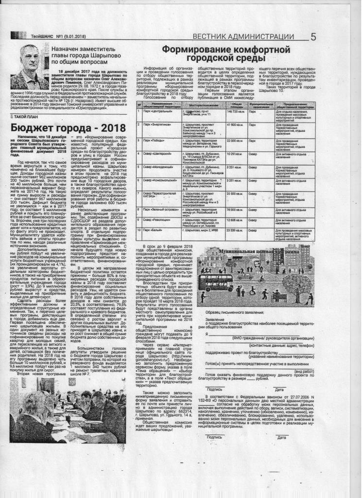 - "Формирование комфортной городской среды", газета "Твой шанс" №1, 09.01.2018
