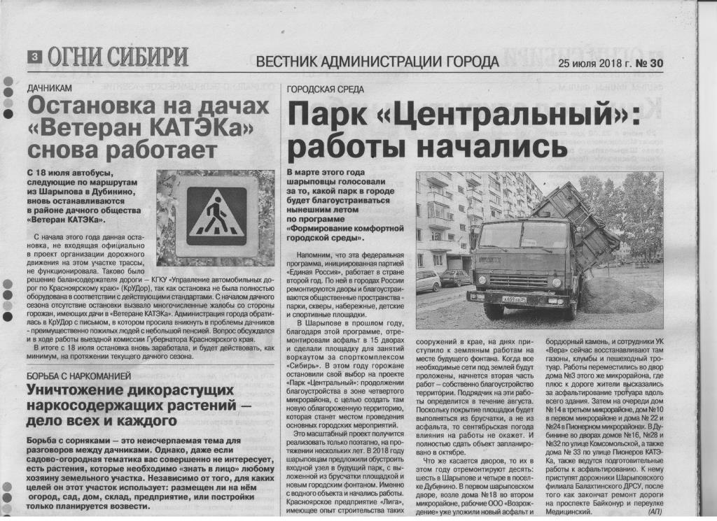 - Парк Центральный: работы начались (газета "Огни Сибири", №30 от 25.07.2018)