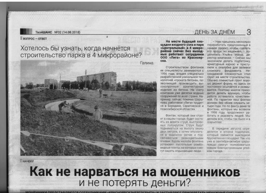 - Четыре двора отремонтированы, фонтан строится (газета "Твой Шанс", №32 от 10.08.2018)