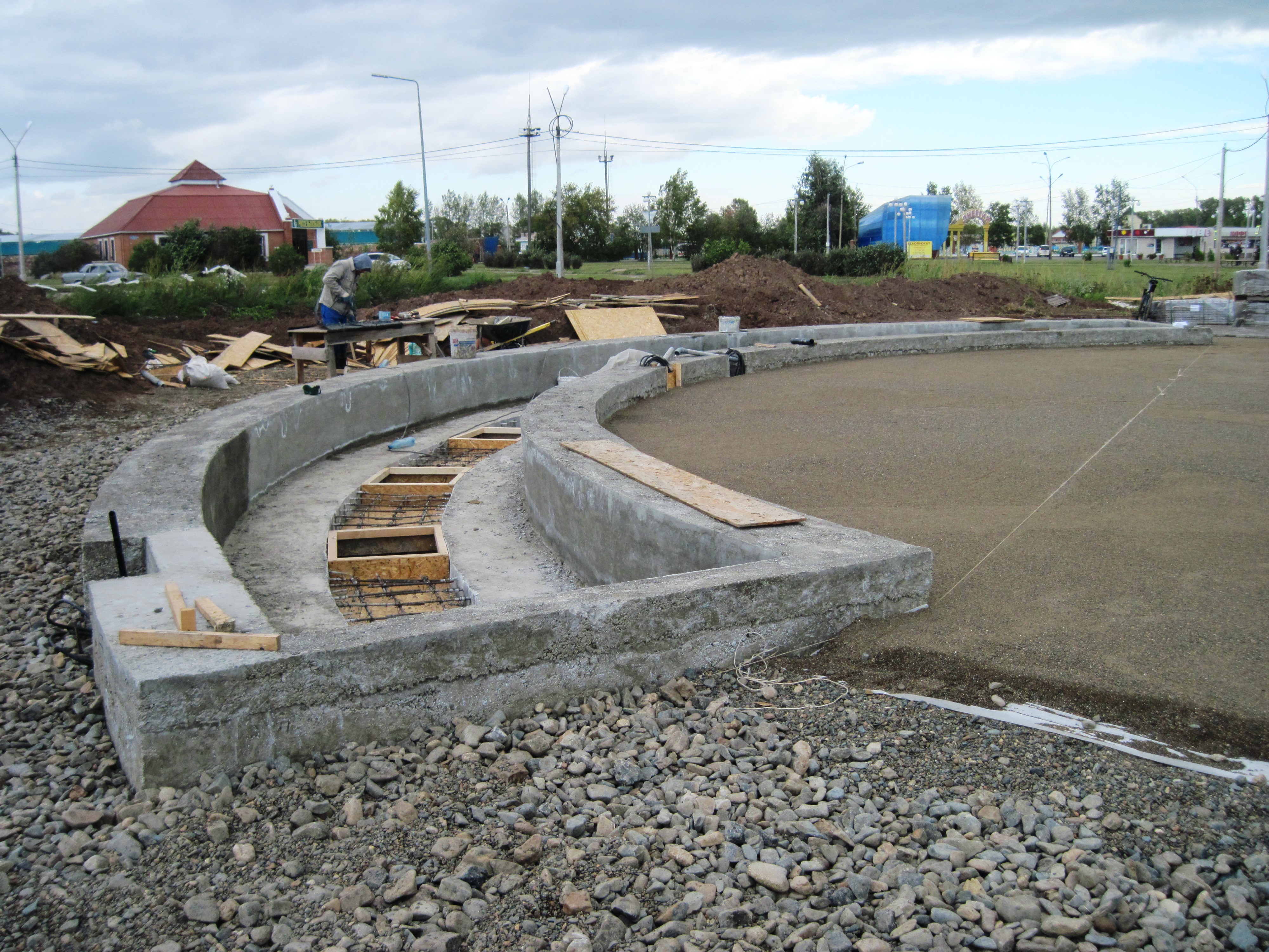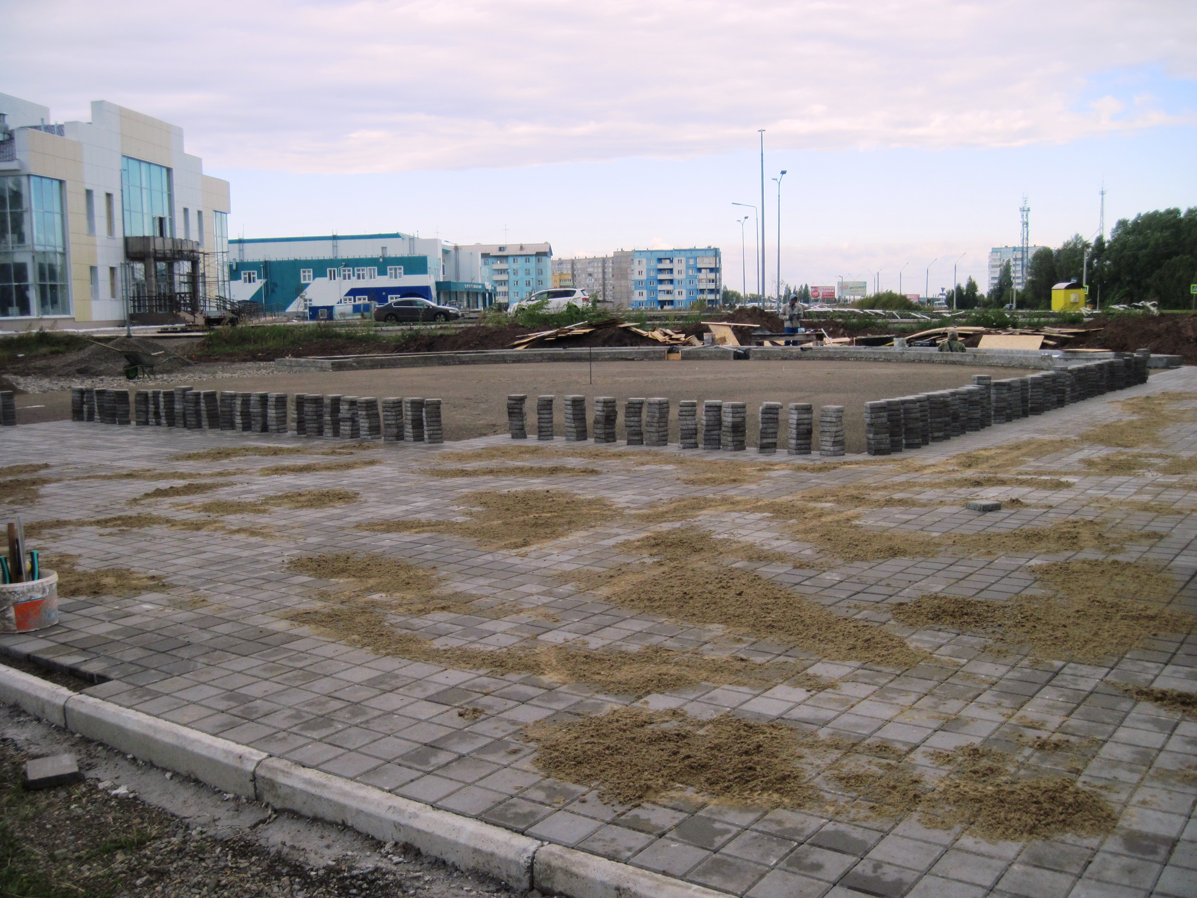 Сейчас на «Входной узле парка «Центральный» - именно так назывался в марте это проект – трудятся два подрядчика. Специалисты красноярского ООО «Лига» завершают оборудование фонтана. А строители из ООО «ААстрой» готовят площадку под укладку брусчатки вокруг.