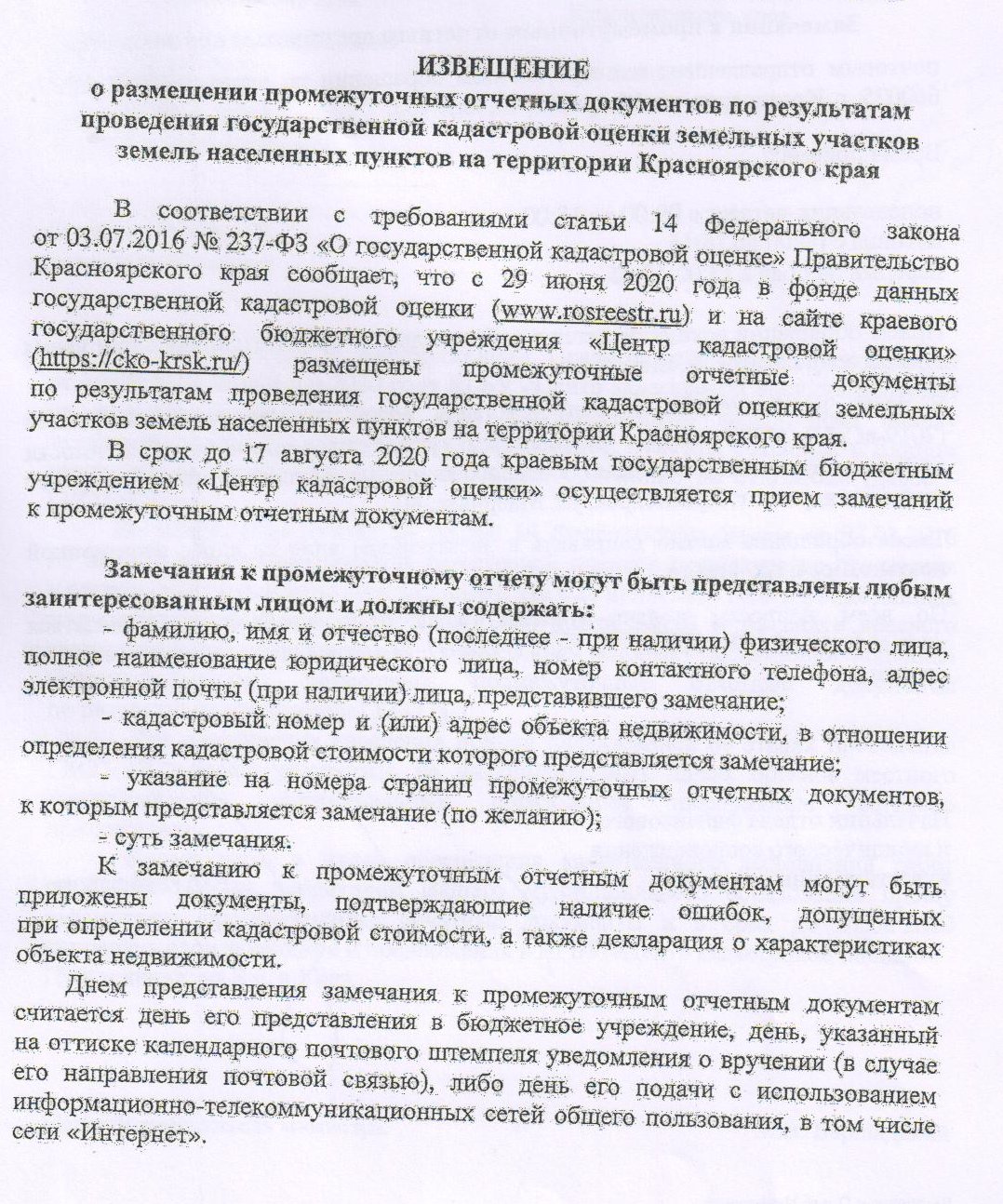 Извещение о размещении промежуточных отчетных документов по результататам проведения государственной кадастровой оценки земельных участков земель населенных пунктов на территории Красноярского края