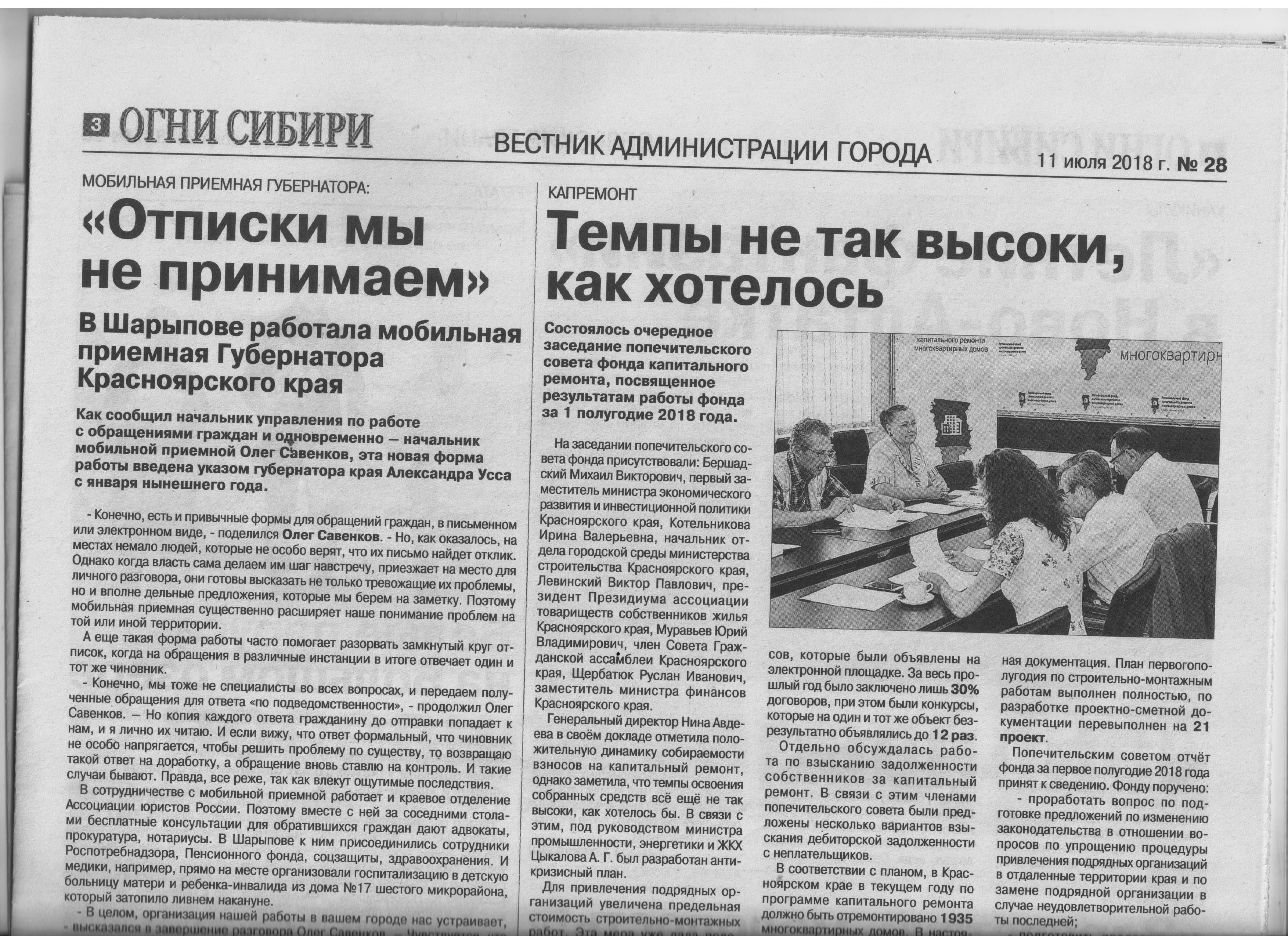 - Заседание попечительского совета фонда капитального ремонта, посвященное результатам работы в 1 полугодии (газета "Огни Сибири", №28 от 11.07.2018)
