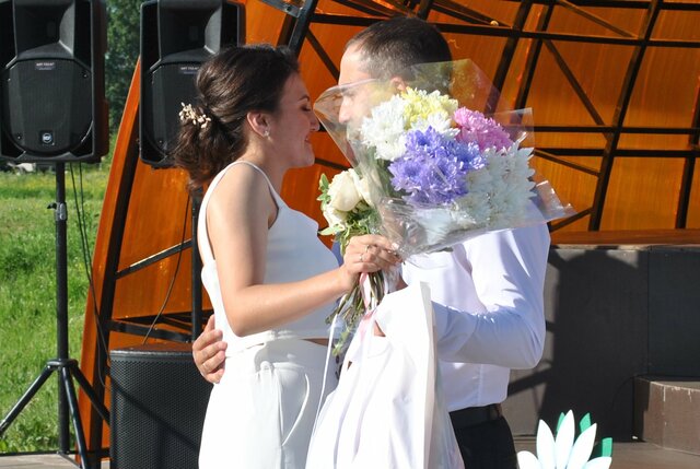 А затем, по традиции на сцену поднялись молодожены — пара, которая зарегистрировала брак именно в этот день — День семьи, любви и верности. Это оказались Алина и Максим Давыденко. Молодоженов также поздравили и пожелали им счастливой семейной жизни. Николай и Эмилия Емельяновы напутствовали молодых людей советом учиться терпению, беречь и уважать друг друга.