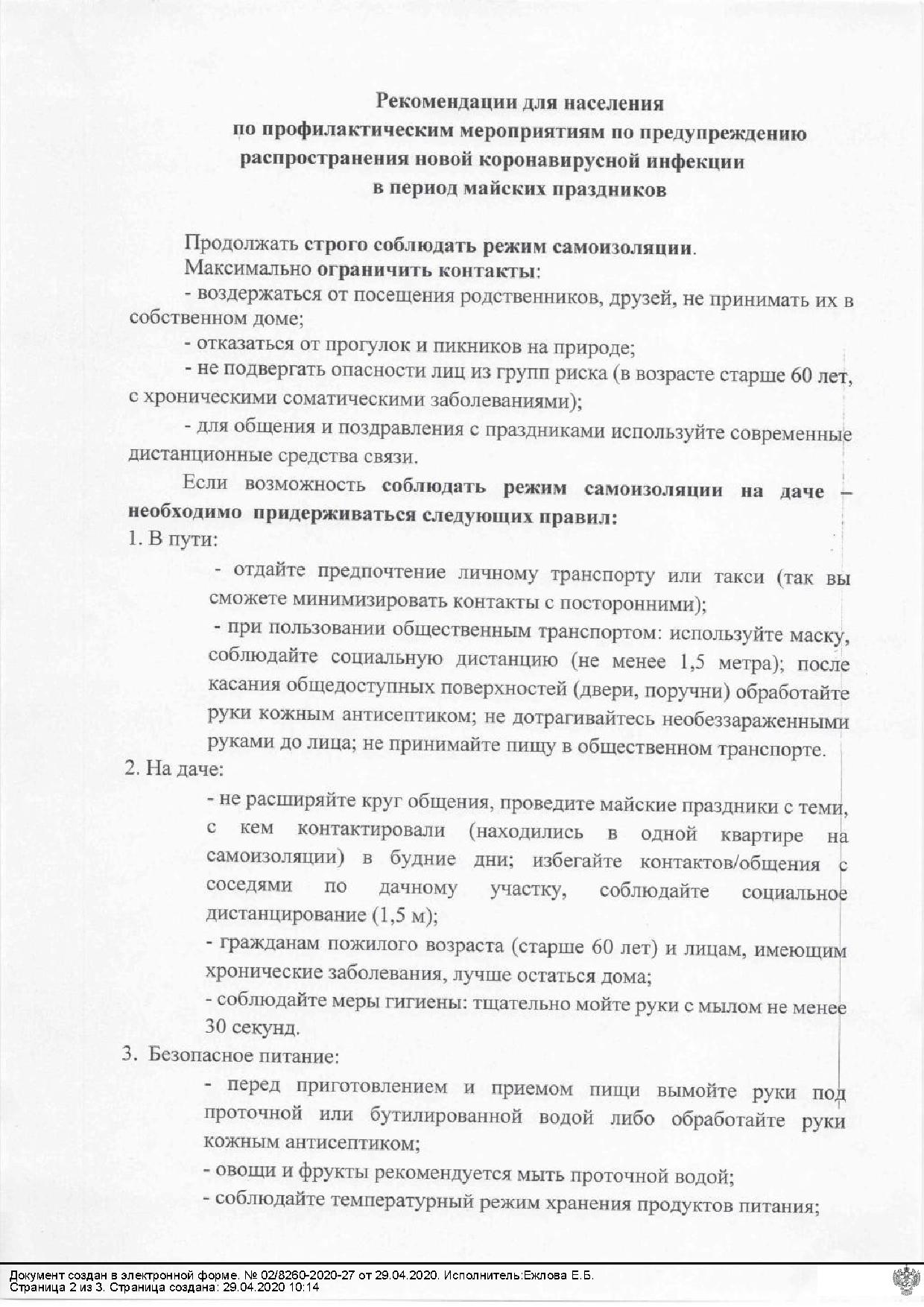 Рекомендации Роспотребнадзора для населения по профилактическим мероприятиям по предупреждению распространения коронавирусной инфекции в период майских праздников