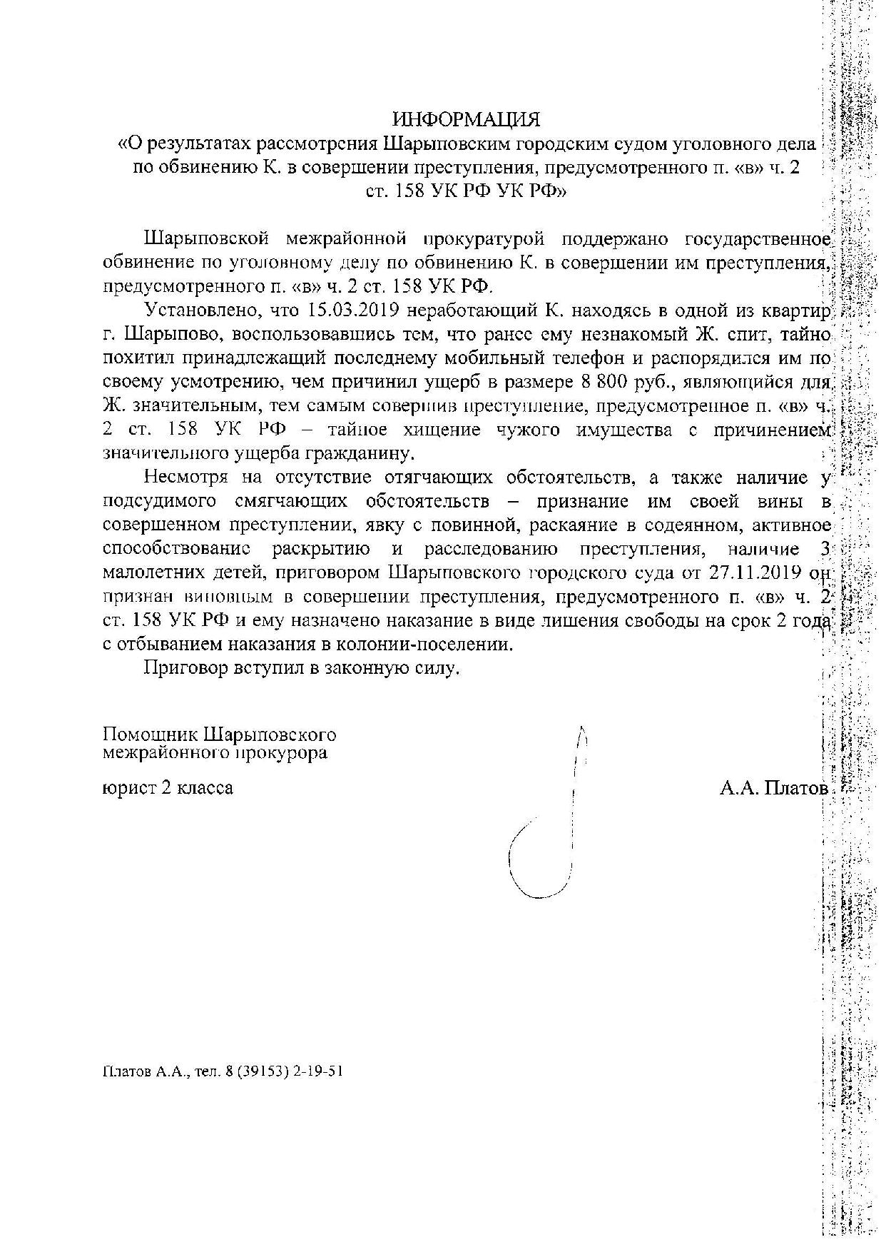 О результатах рассмотрения Шарыповским городским судом уголовного дела по обвинению К. в совершении преступления, предусмотренного пунктом "в" части 2 ст. 158 УК РФ