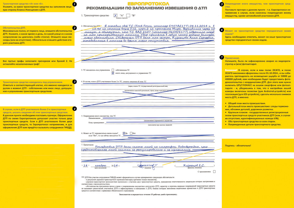 В этих случаях водителям необходимо осуществить фотосъемку (видеозапись) положения транспортных средств по отношению друг к другу и объектам дорожной инфраструктуры, следов и предметов, относящихся к происшествию, повреждений транспортных средств.  Нарисовать схему и оформить извещение о происшествии, после чего обратится в страховую организацию.