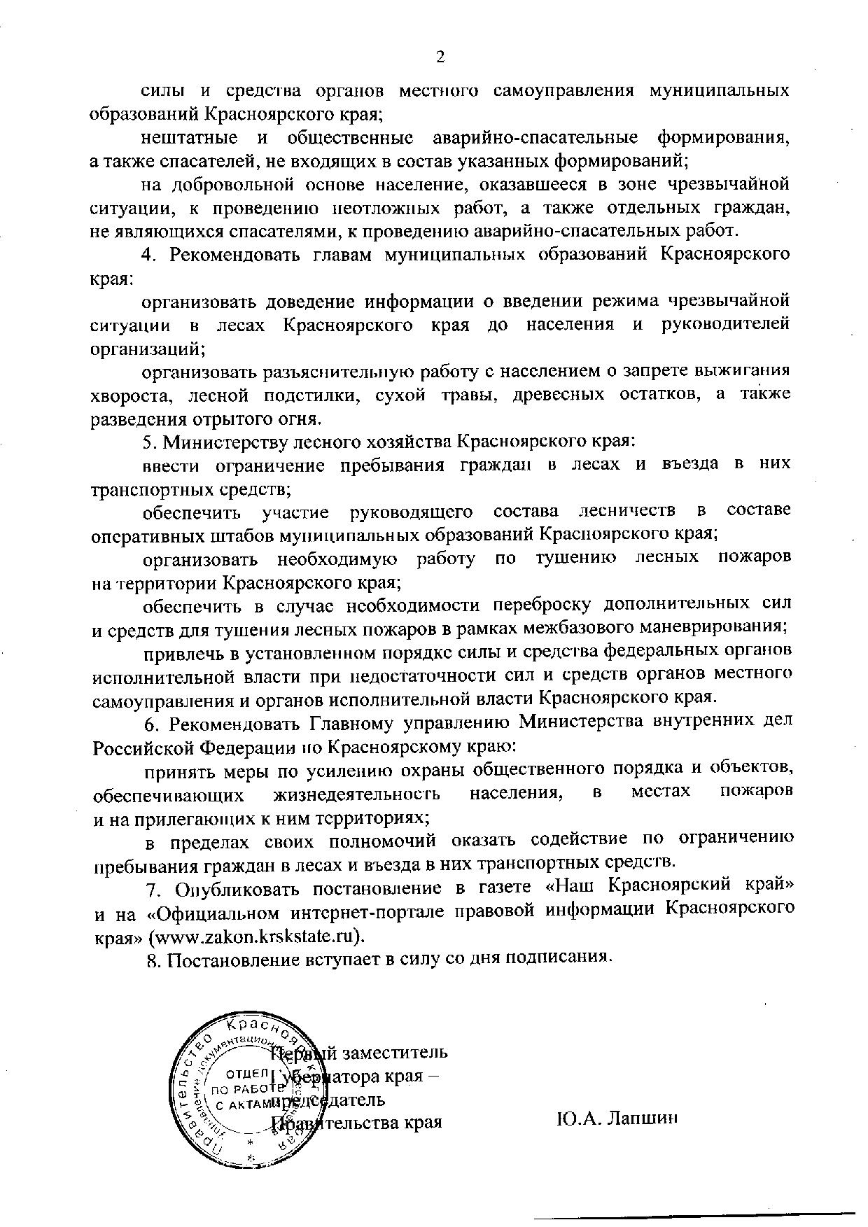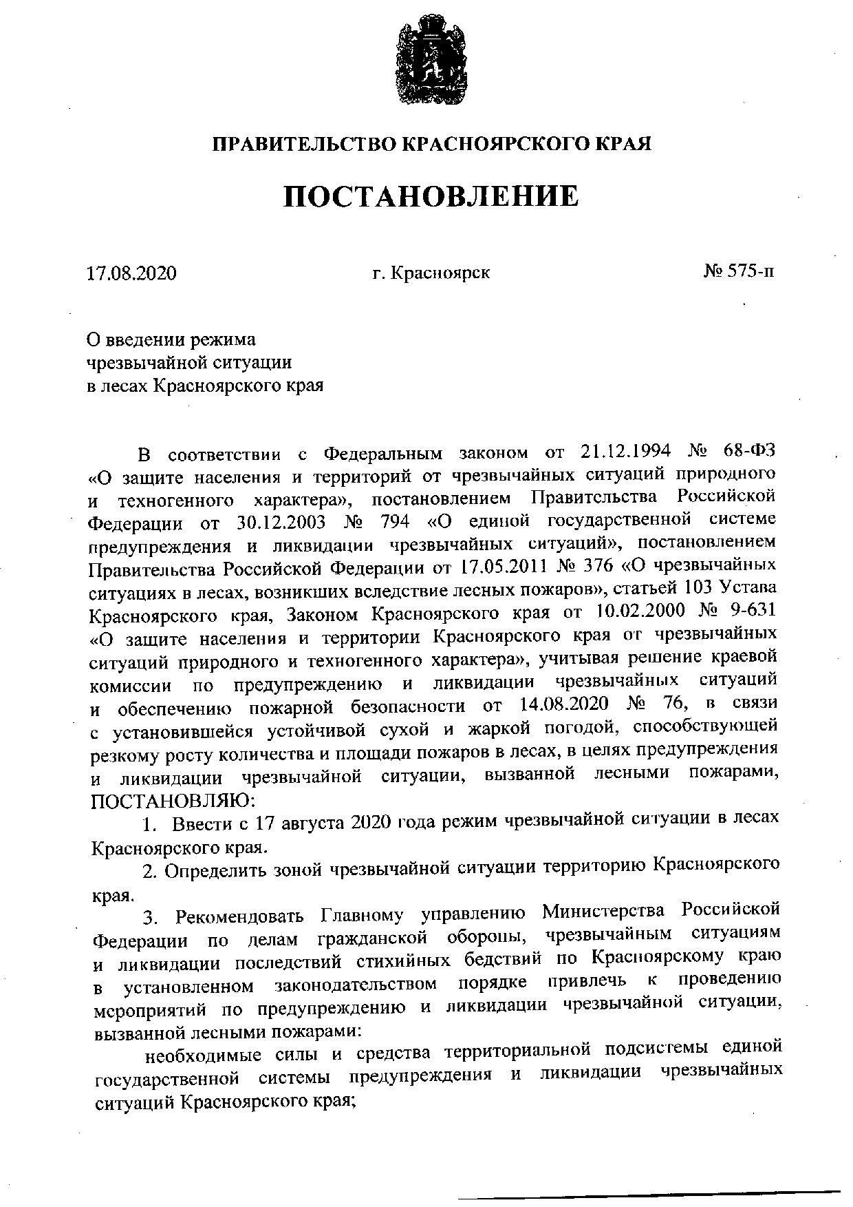 Постановление Правительства Красноярского края от 17.08.2020 №575-п "О введении режима чрезвычайной ситуации в лесах Красноярского края"