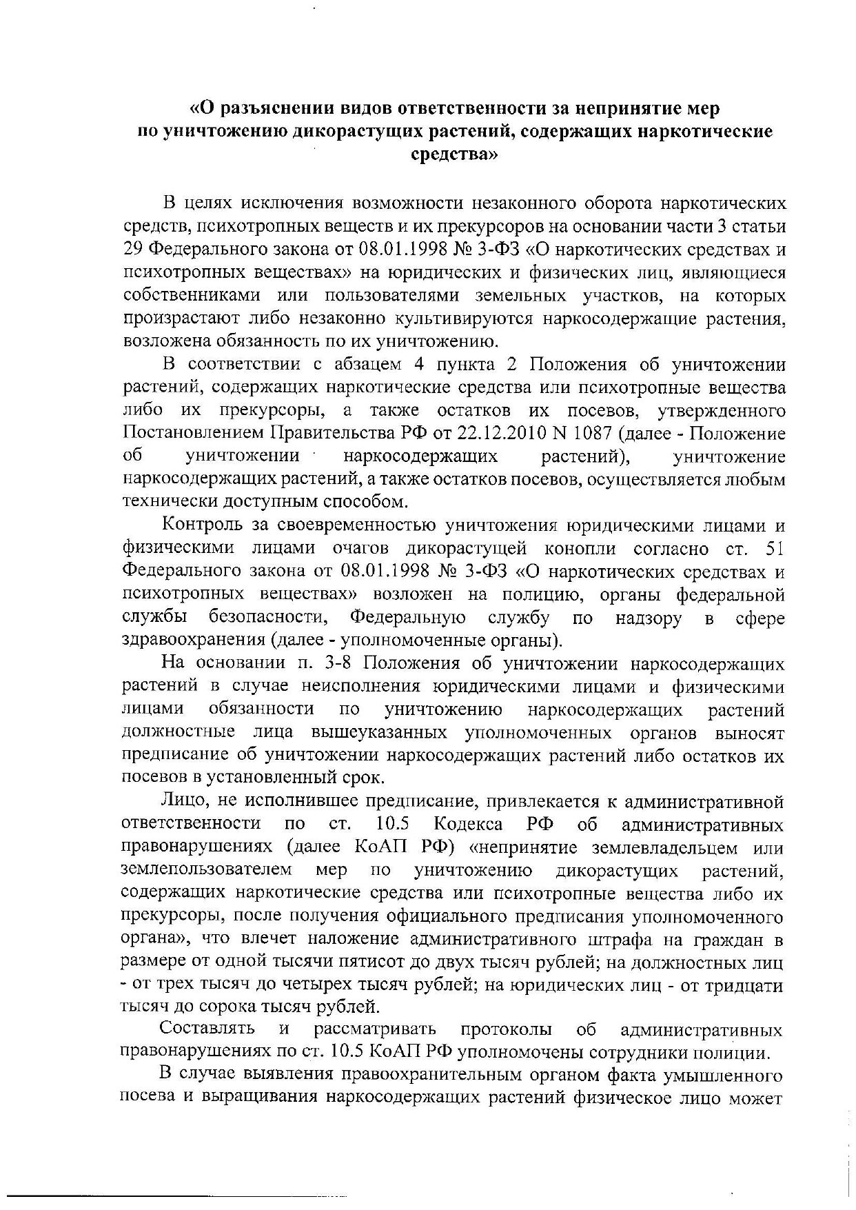 О разъяснении видов ответственности за неприятие мер по уничтожению дикорастущих растений, содержащих наркотические вещества