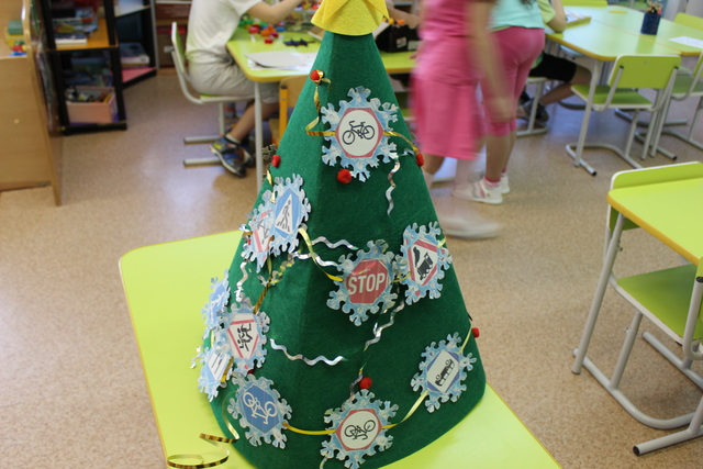 После чего дошкольники изготовили новогодние игрушки для праздничной елки по тематике безопасности дорожного движения в виде дорожных знаков, из которых получилась целая гирлянда, и совместно с автоинспекторами украсили Новогоднюю ель.