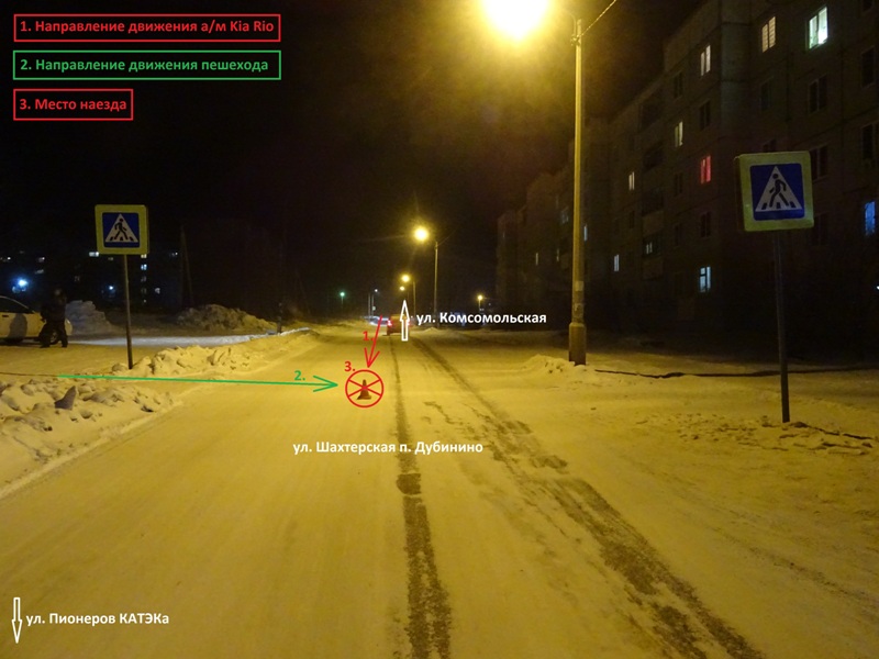 Накануне в вечернее время в п. Дубинино на улице Шахтерская водитель 1956 г.р. управляя автомобилем «Кио Рио» допустила наезд на женщину, которая двигалась по нерегулируемом пешеходному переходу. В результате ДТП пешеходу 1985 г.р. оказана разовая медицинская помощь. Пострадавшая была одета в одежду темных тонов без световозвращающих элементов. Водитель освидетельствована на месте ДТП, состояние опьянения не установлено.