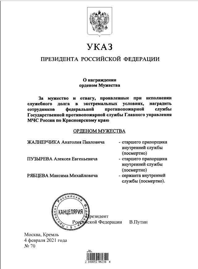 Президент РФ посмертно наградил троих красноярских пожарных Орденом Мужества