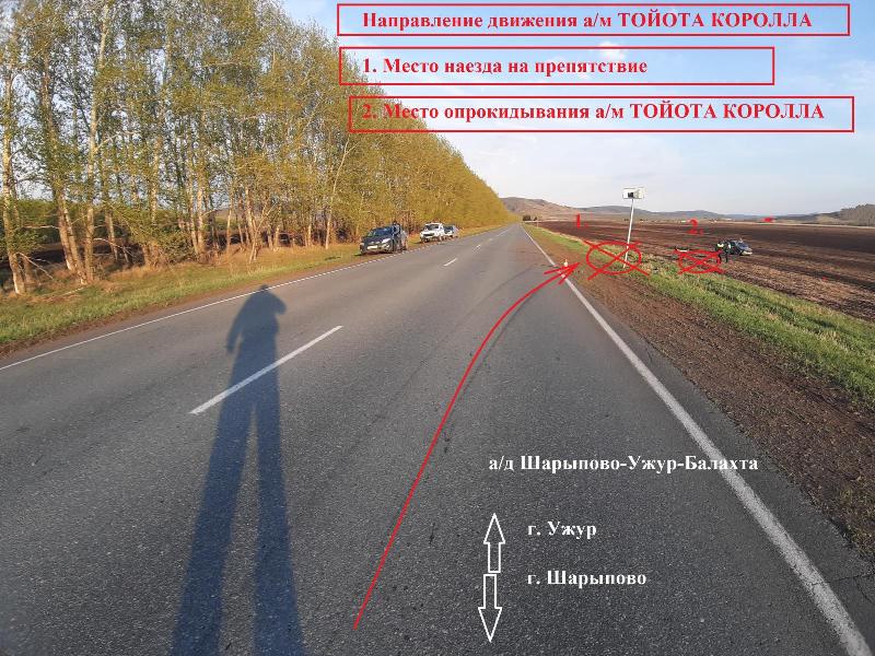 Накануне в вечернее время на 18 км автодороги Шарыпово-Ужур-Балахта 29-летний водитель управляя автомобилем «Тойота Королла» допустила наезд на препятствие (стойку дорожного знака) с последующим съездом в правый кювет по ходу движения транспортного средства и опрокидыванием автомобиля. В результате данного происшествия 2 несовершеннолетних пассажира 2 и 4 лет получили множественные ушибы, детям назначено амбулаторное лечение.