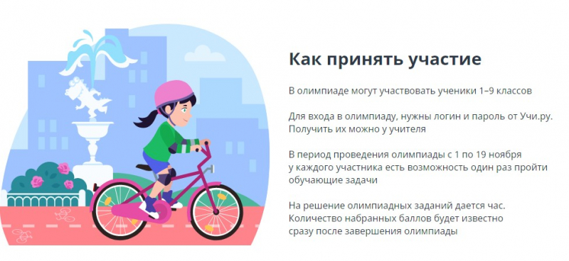 Для входа в олимпиаду, нужны логин и пароль от Учи.ру. Получить их можно у учителя. В период проведения олимпиады с 1 по 19 ноября у каждого участника есть возможность один раз пройти обучающие задачи