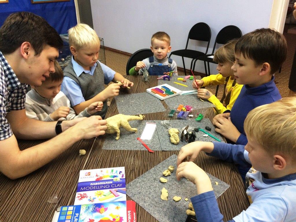 Затем дети принялись за творческое задание – из скульптурного пластилина они лепили фигурки понравившихся динозавров. Четверо ребят постарше делали совместную работу и  вылепили мини-копию стегозавра. Все поделки заняли законное место на полках музея и станут экспонатами финальной выставки «Школы», которая пройдет в конце декабря.