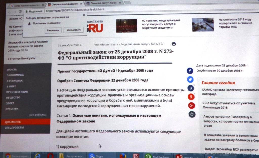 8 декабря, в библиотеке им. С. Есенина прошёл устный журнал «О противодействии коррупции». Библиотекари собрали в аудитории пожилых людей, которым непросто следить за активным изменением законодательства в этой сфере. Особенно много вопросов вызвала тема профилактики коррупционных проявлений в сфере здравоохранения. Наряду с документами на традиционных носителях участникам мероприятия был представлен сайт в сети Интернет «Консультант+». Участники встречи получили  информация о том, как можно воспользоваться документами сайта.