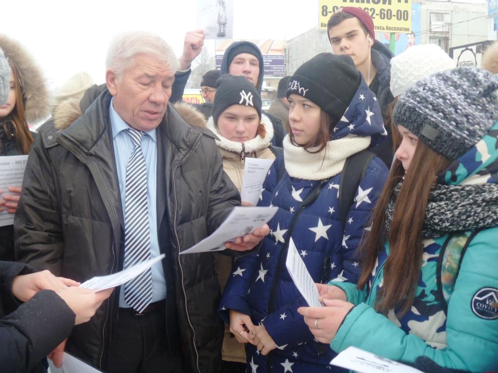 Совместно с Н.К.Милюковым - депутатом городского Совета, председателем комиссии г.Шарыпово по профилактике коррупционных и иных правонарушений и А.А.Ворошиловым – Почетным гражданином города, членом этой же комиссии школьники раздавали горожанам антикоррупционные листовки с телефонами доверия, по которым нужно звонить при выявлении случаев взяточничества и злоупотребления служебными полномочиями. 10 «а» , принимавший участие в акции, был выбран для этого не случайно, ведь профориентация этого класса – правовая.