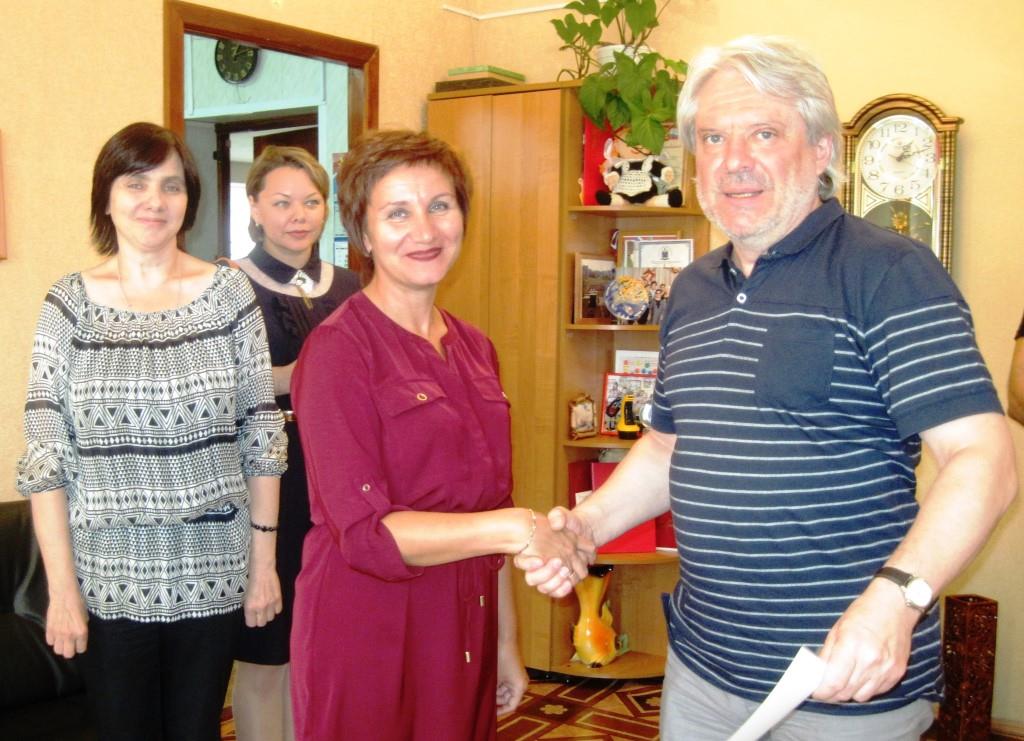 Алексей Перепелкин вручает Светлане Орловой сертификат об успешном обучении.