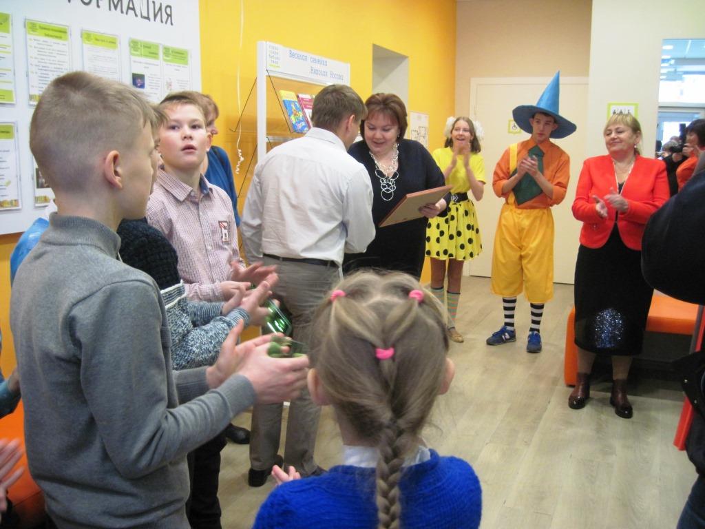 О том, что библиотека открыта, коротыш Незнайка возвестил громким выстрелом из хлопушки и пригласил гостей праздника в фойе. Да-да, теперь у библиотеки есть фойе, вход с пандусом, гардероб, игровая комната для совсем маленьких детишек, где мама может побыть с малышом, пока старший ребенок занят чтением. Есть даже мини-кухня, где можно согреть чай или детское питание.