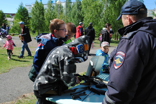 Для ребят постарше и посерьезней и занятия были основательные. Так, воспитанники 7 взвода кадетского корпуса Алексей Паклинов, Егор Раицкий и Илья Крупский разбирали и собирали автомат, который выставили на своем стенде вместе с другими спецсредствами шарыповские полицейские. Автомат оказался туговат по сравнению с учебным оружием в корпусе, но трудности только раззадорили юных кадетов.