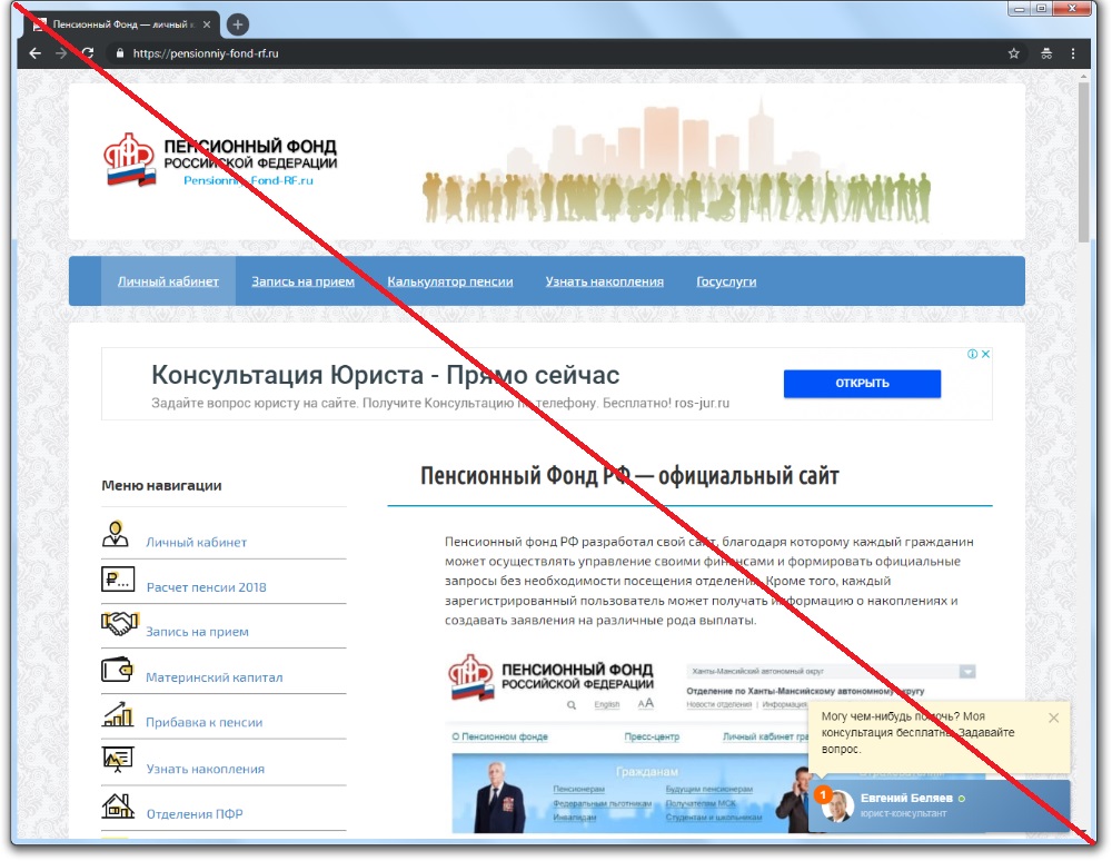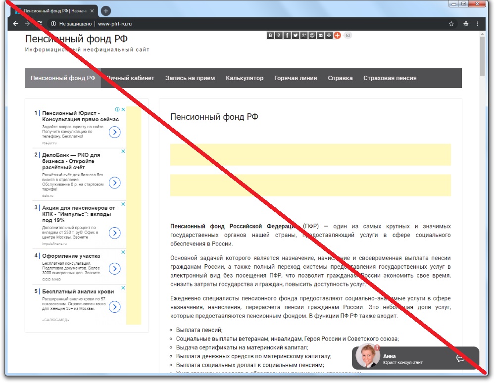 На самом деле все это лишь служит прикрытием сомнительных сервисов, предоставляемых через такие ресурсы. Плохо структурированная организация сайтов-подделок и наличие большого количества рекламных баннеров сильно осложняет восприятие информации. Делается это умышленно, поскольку на помощь растерявшемуся в информационном хаосе пользователю всегда приходит онлайн-чат с «пенсионным юристом», предлагающим разобраться со всеми вопросами. Переписка при этом длится недолго и для решения проблемы человеку практически сразу предлагается оставить контактный номер телефона. Через некоторое время на него поступает звонок с предложением обратиться в «правовой центр поддержки», где человеку обещают помочь с оформлением причитающихся выплат. Такая помощь не бесплатна, но об этом клиенты «пенсионных юристов» узнают потом, как и о том, что обещанных выплат или «прибавок» в действительности не существует либо для них нет юридических оснований.