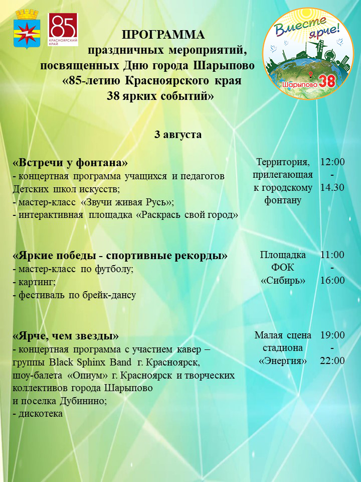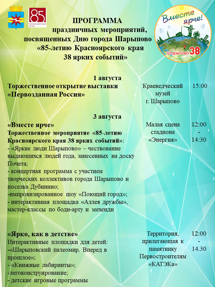 В этом году сквозной нитью торжества станет лозунг «Вместе ярче!». Он объединяет историю города Шарыпово с историей всего Красноярского края, который в этом году отмечает 85-летний юбилей.