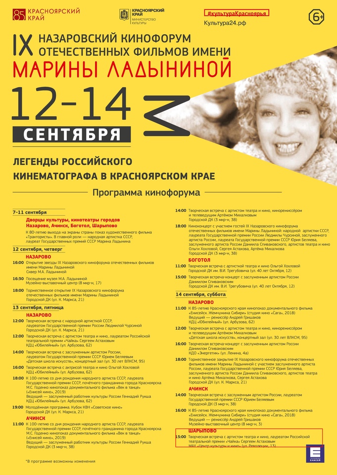 Программа IX Назаровского кинофорума имени Марины Ладыниной, 12-14 сентября 2019 года