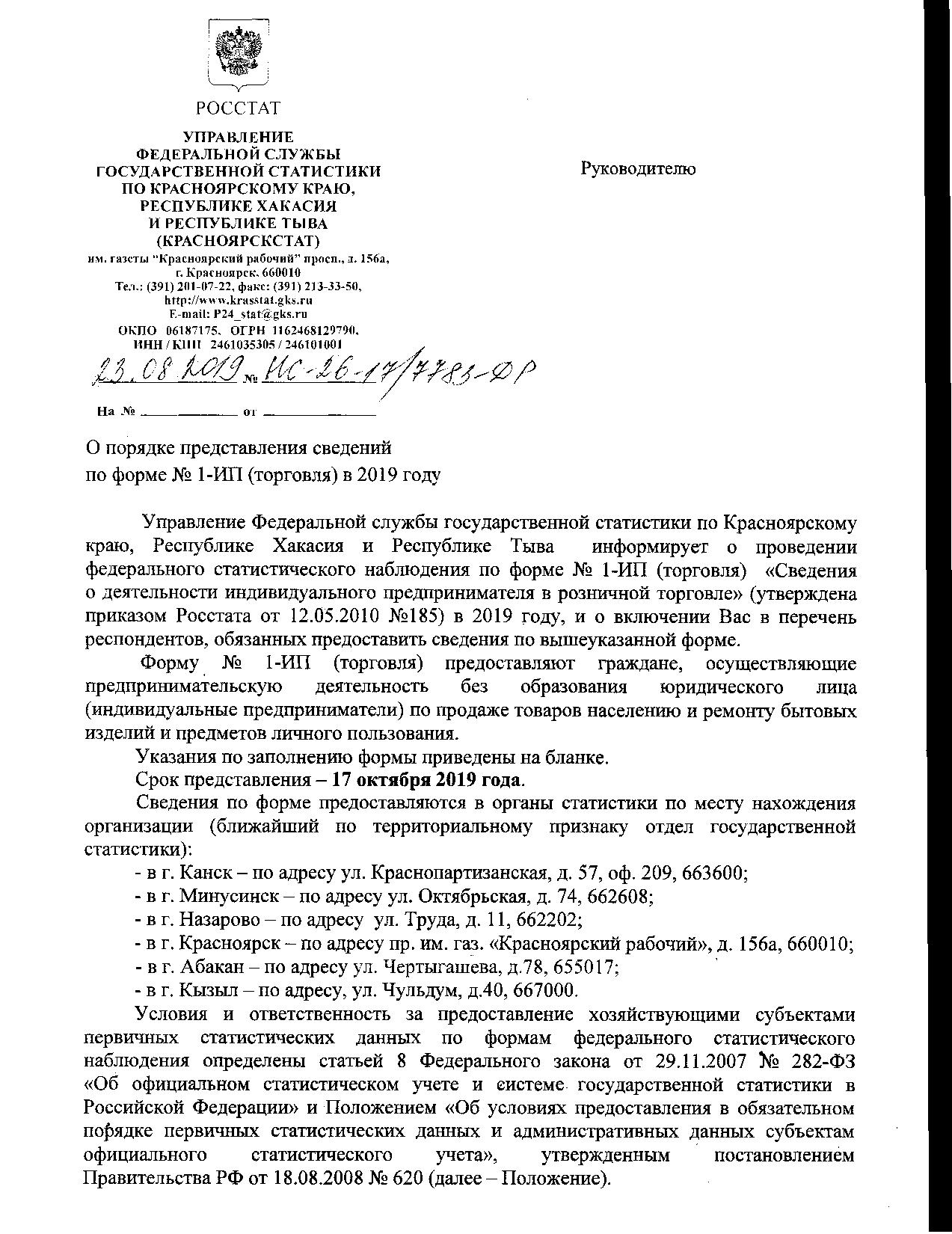 О порядке предоставления сведений по №1-ИП(торговля) в 2019 году