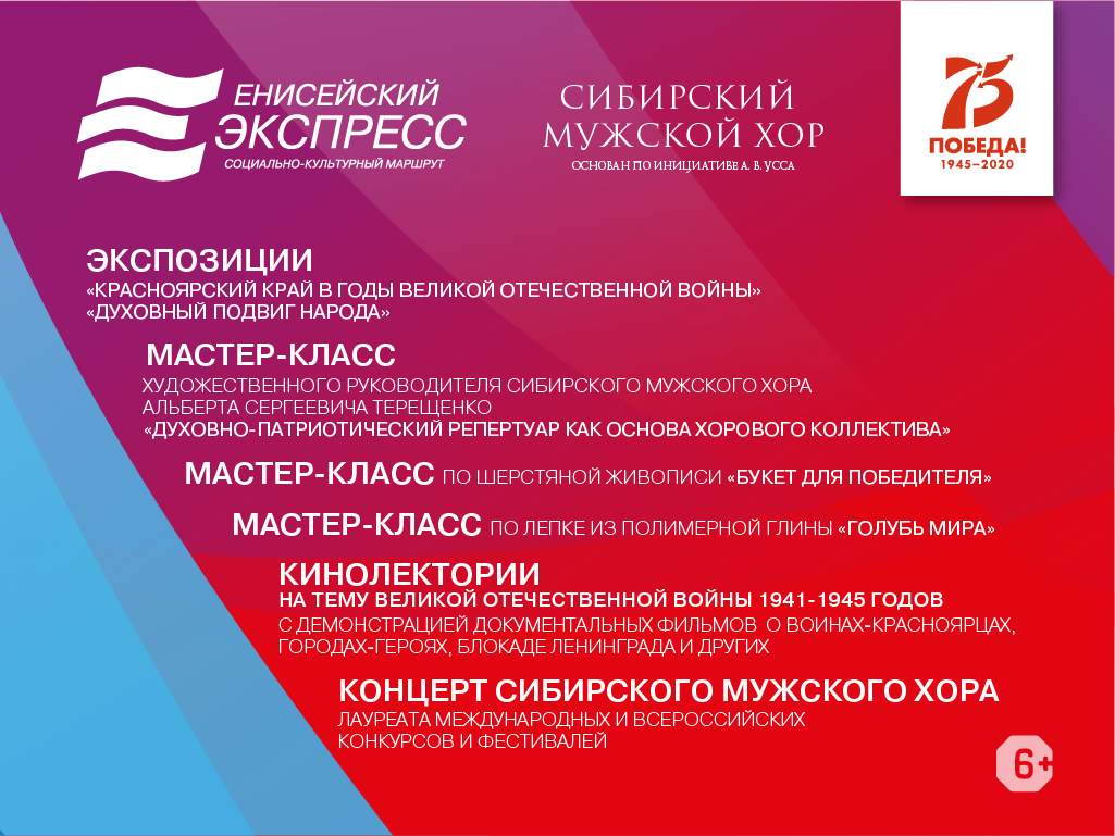 В этом году мероприятия «Енисейского экспресса» приурочены к 75-летию Победы советского народа в Великой Отечественной войне 1941-1945 годов и пройдут в рамках объявленного Президентом Российской Федерации Года Памяти и Славы.