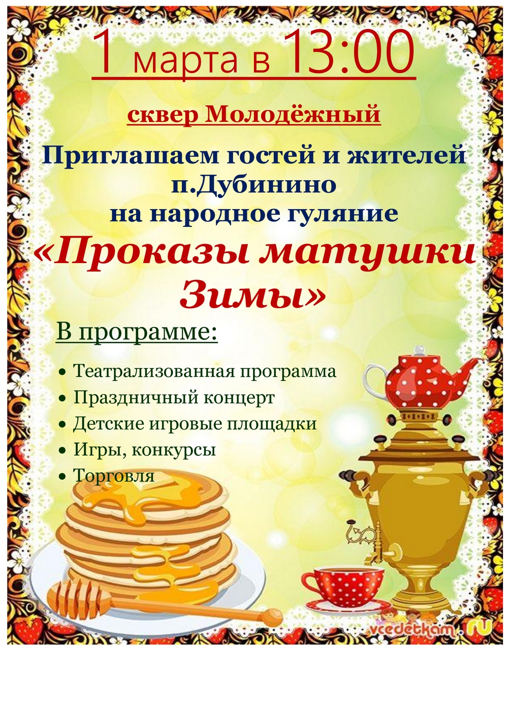 Всех, кто желает проводить зиму и встретить весну в лучших русских традициях, ждут 29 февраля в 12.00 час. в парке Центральный (г. Шарыпово) и 1 марта в 13.00 час. в парке Молодежный (п. Дубинино).