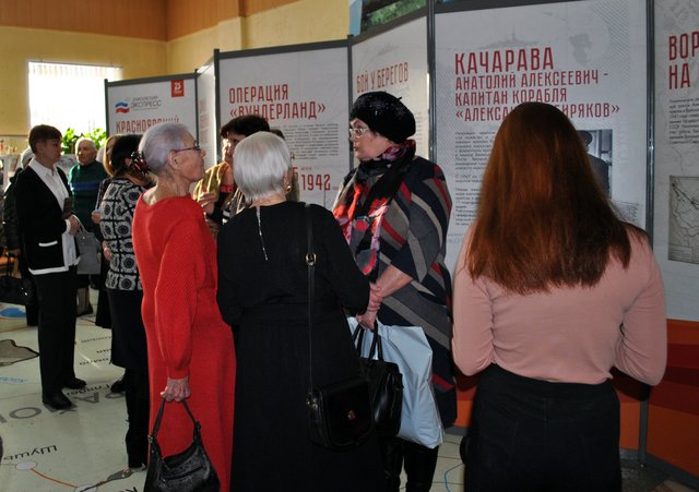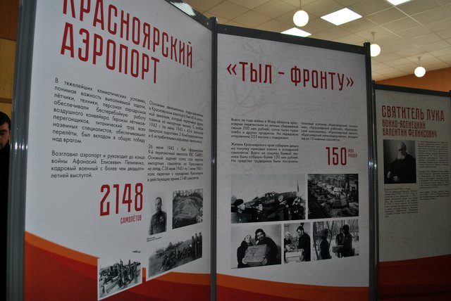 Тем временем в фойе Шарыповского ГДК развернулись выставки «Красноярский край во время Великой Отечественной войны» и «Духовный подвиг народа». Они открывали зрителям страницы истории нашего края, связанные с вкладом красноярцев в Победу. Бои на Диксоне и подвиг моряков парохода «Александр Сибиряков», которые отдали свои жизни, пробиваясь через ледяные поля по Северному морскому пути. Легендарный Алсиб — «Красноярская воздушная трасса» Аляска-Сибирь, по которой в СССР перегонялись американские самолеты для фронта. Экспозиция «Духовный подвиг народа» рассказала о подвиге фронтовиков-священнослужителей, внесших неоценимый вклад в Победу, в том числе о судьбе Луки Войно-Ясенецкого, благодаря которому свое развитие получила отечественная военно-полевая хирургия.