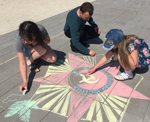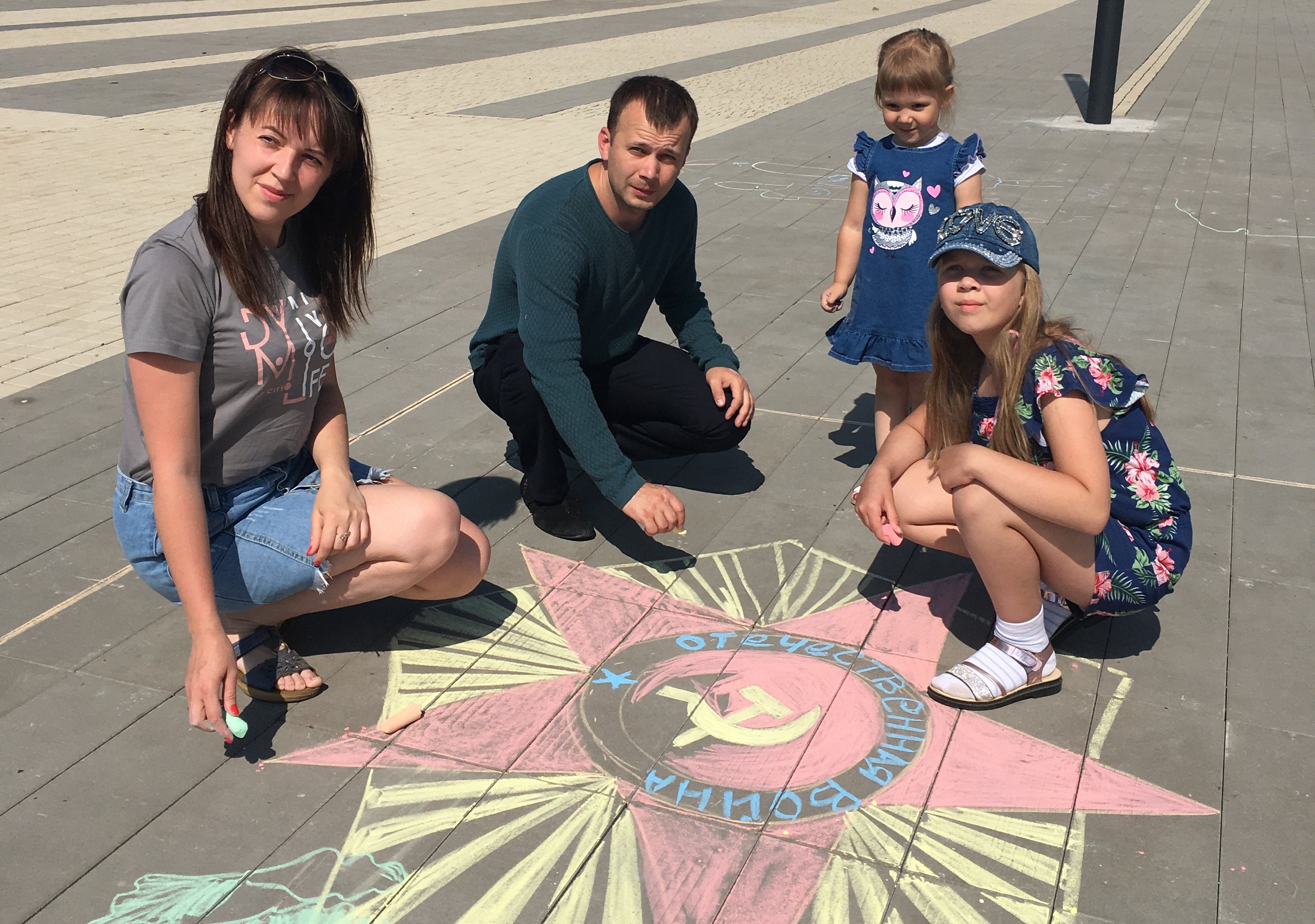 Семья Белобородовых -  мама Лиля, папа Алексей , дочери Милана и Алина — приняли участие в акции «Я рисую мелом»,  в честь  75-й годовщины Победы в Великой Отечественной войне 1941–1945 годов и Парада Победы 24 июня 1945 г. Дружная семья изобразила на брусчатке площади в парке «Центральный» орден военного времени.