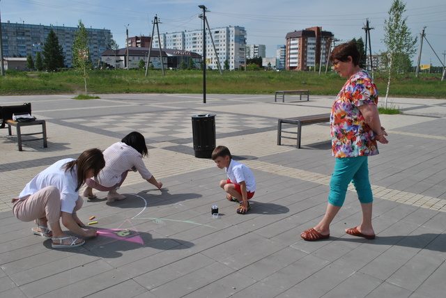 На площади в парке Центральный собрались семьи, которые решили принять участие в акции «Я рисую мелом». Смысл акции – всей семьей, вместе с детьми, придумать и нарисовать на асфальте рисунок на тему Победы. Ведь такой рисунок – это символ радости, мира, семейного благополучия. И добрый пример воспитания патриотизма – личным примером через детские воспоминания, которые сохраняются у человека на всю жизнь.