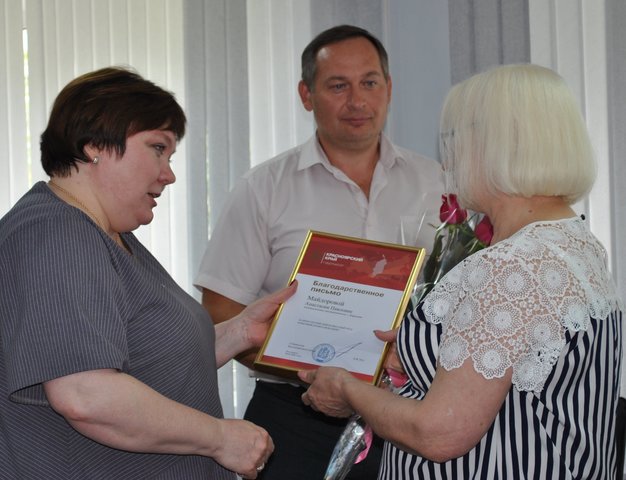 Сегодня Глава города Наталья Петровская вручила награды четверым шарыповским предпринимателям. 25 июля в России отмечался профессиональный праздник - День работников торговли. В связи с этим Наталья Петровская вручила Благодарственное письмо Губернатора Красноярского края и поблагодарила за многолетний труд и высокий профессионализм индивидуального предпринимателя, руководителя торгового центра «Ладушки» Анастасию Майдорову. Благодарственные письма от Министерства сельского хозяйства и торговли Красноярского края также были вручены индивидуальному предпринимателю, руководителю пекарни «Каравай» Анастасии Рузановой, индивидуальному предпринимателю, руководителю компьютерного салона «Реал-Ком» Михаилу Доманину и коммерческому директору компьютерного салона «Реал-Ком» Денису Першину.