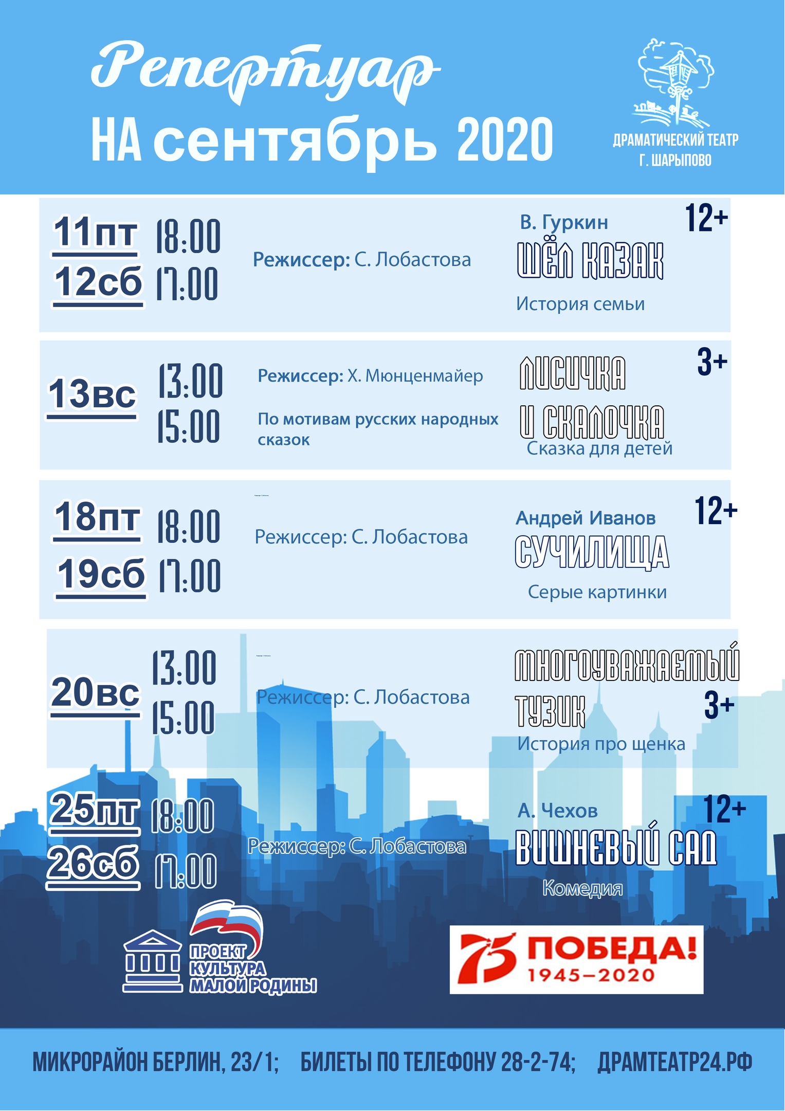 В Шарыпове возобновляется показ кинофильмов и спектаклей городского театра. Первые фильмы зрители увидят уже в конце этой недели, 4-6 сентября,  а первые спектакли состоится 11 и 12 августа. Афиши и расписания можно узнать на привычных ранее группах в социальных сетях «КИНОАФИША ШАРЫПОВО» и «ДРАМАТИЧЕСКИЙ ТЕАТР г. ШАРЫПОВО», либо по телефонам: 2-19-54 (кино), 28-2-74 (театр)