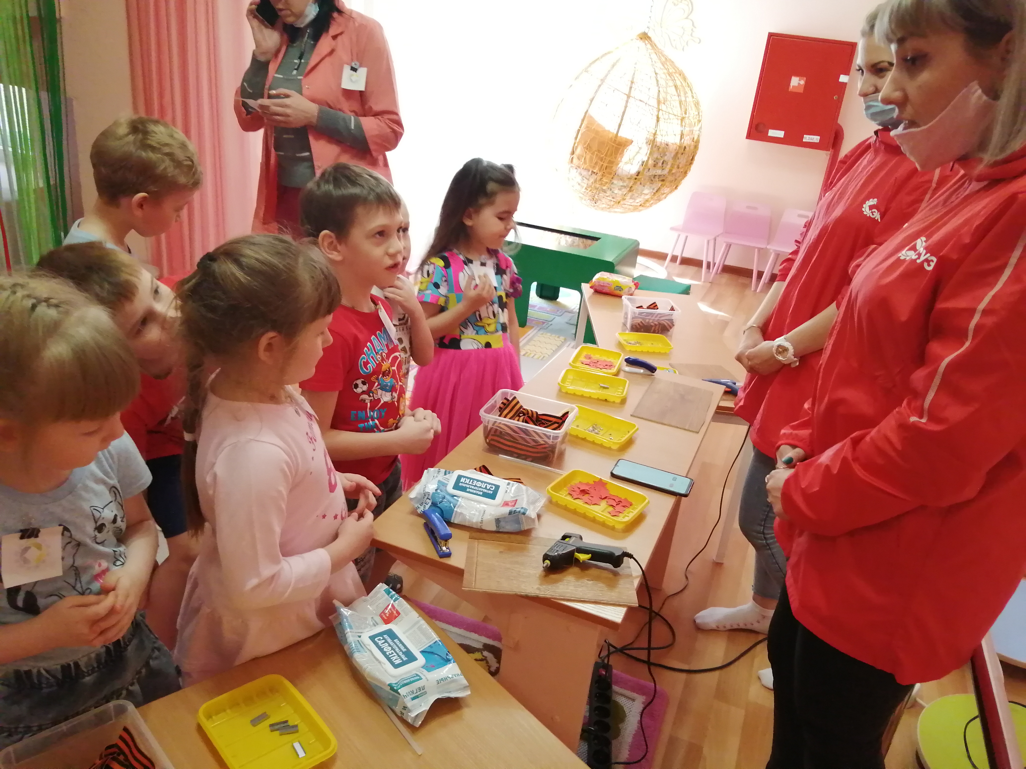 Поскольку встреча в детском саду проходила в канун 9 мая, волонтеры Березовского разреза провели для малышей мастер-класс по оформлению нагрудных знаков из Георгиевской ленты. "Я сегодня сама сделала значок из Георгиевской ленты и буду носить его в честь Дня Победы. Еще я узнала, что волонтеры раздают такие ленты в праздник людям. Я обязательно буду волонтером и буду помогать жителям нашего города", - говорит Дарья Смолякова, воспитанница детского сада "Чебурашка".