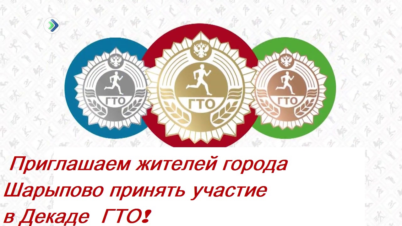Уважаемые жители города Шарыпово! Приглашаем Вас, принять участие в Декаде ГТО. Каждому участнику будет предоставлена возможность выполнить нормативы комплекса ГТО.