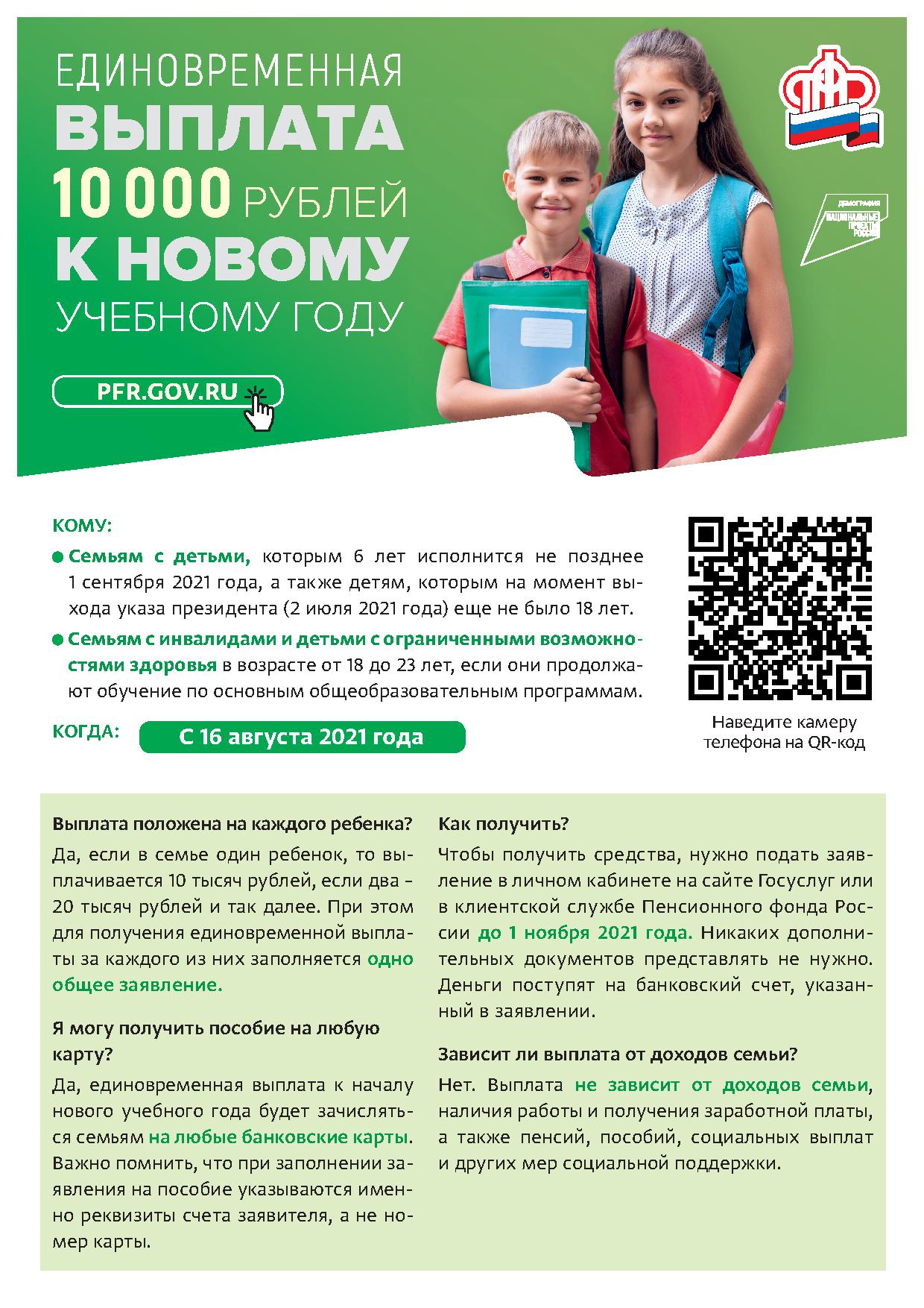 Выплата будет осуществлена единоразово с 16 августа 2021 года по 31 декабря 2021 года. При этом подать заявление можно вплоть до 1 ноября 2021 года.