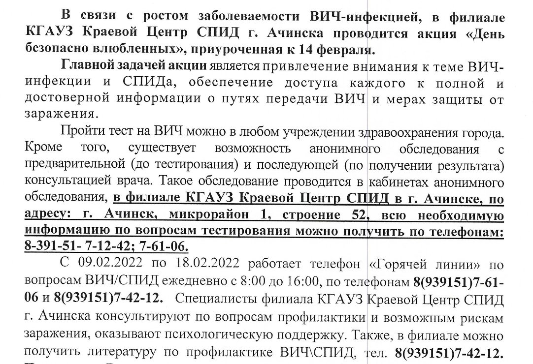 О профилактической акции КГАУЗ "Краевой центр СПИД г. АЧинска", приуроченной к 14 февраля.