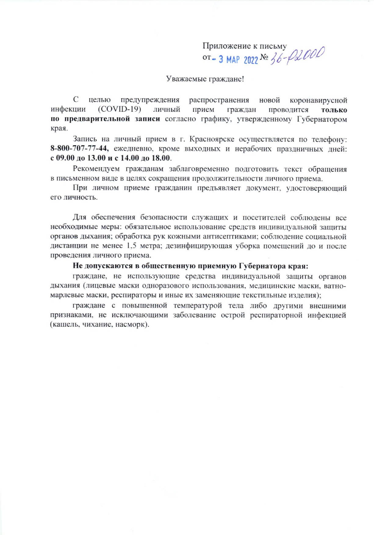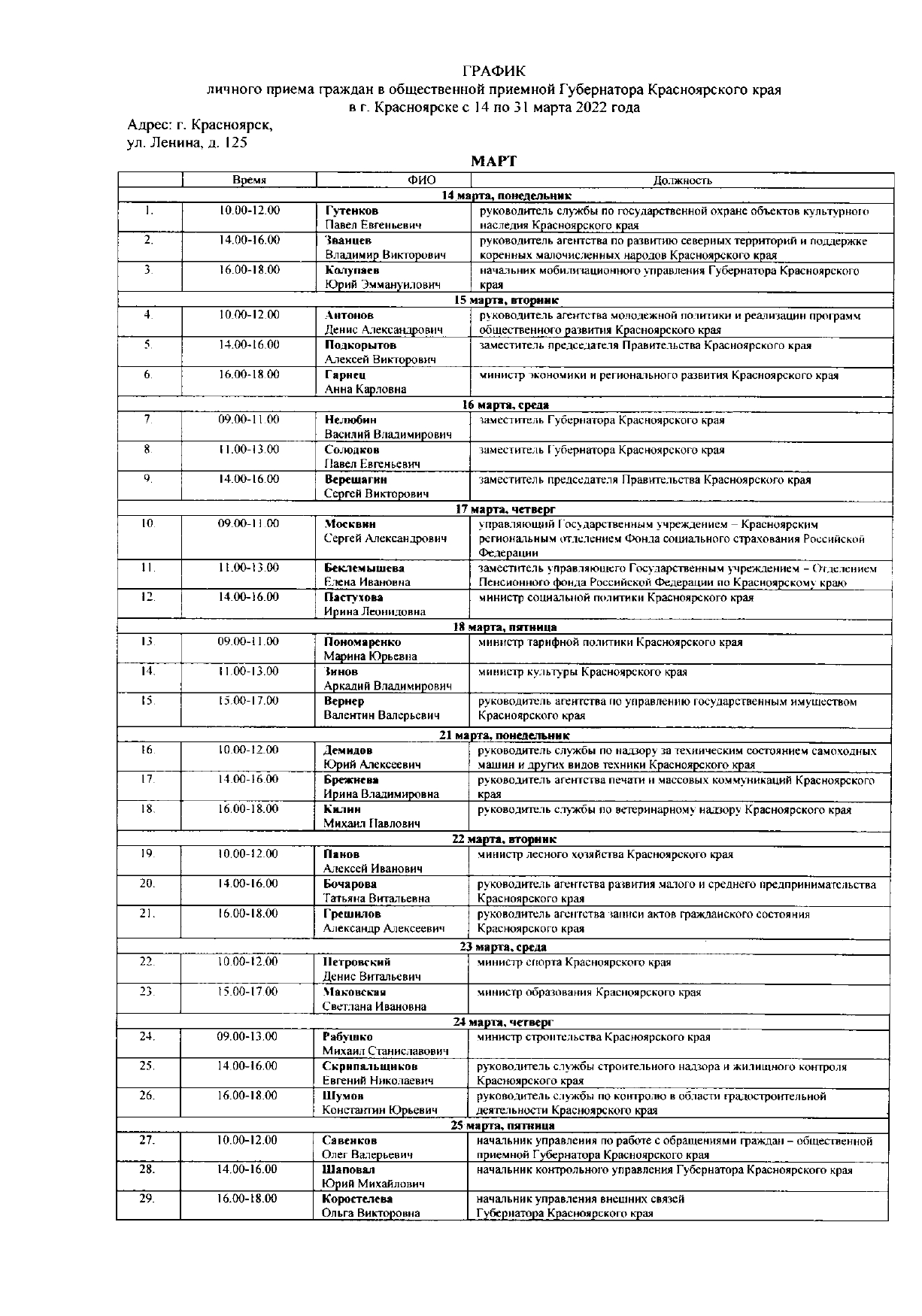 График личного приема граждан в общественной применой Губернатора Красноярского края в г. Красноярске с 14 по 31 марта 2022 года