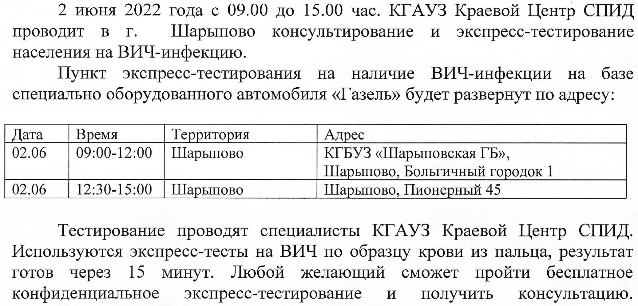 Об экспресс-тестировании на ВИЧ 2 июня 2022 года в городе Шарыпово