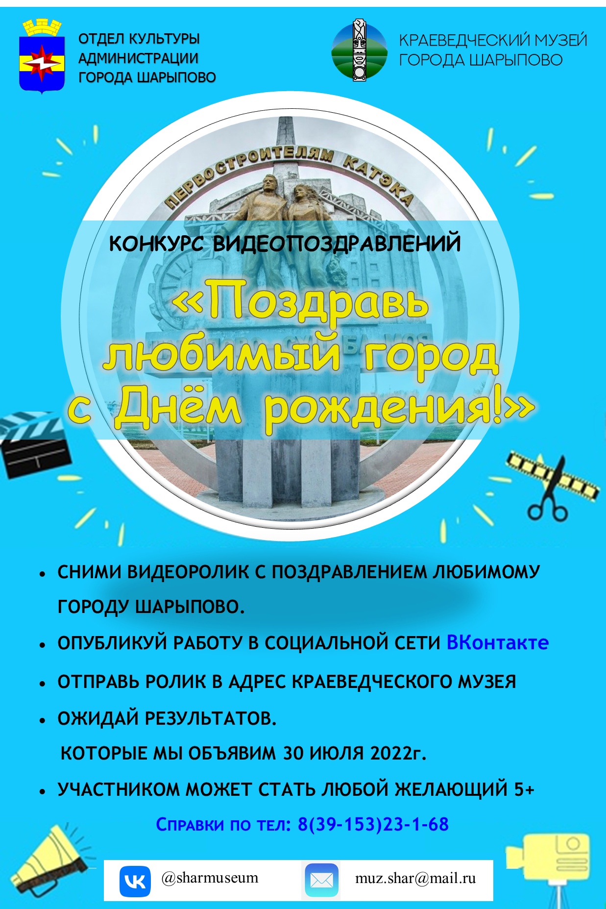 Накануне праздника краеведческий музей объявил конкурс видеопоздравлений «Любимому городу». Принять участие в нем несложно. Для этого необходимо сделать креативное видеопоздравление на фоне городских пейзажей с текстом творческого поздравления. Разместить видео ролик на своей странице в «ВКонтакте» с хештегами: #Шарыпово_41, #люблюШарыпово, #СднемрожденияШарыпово и отметить @sharmuseum, а также отправить видео материал на электронный адрес muz.shar@mail.ru с пометкой «Конкурс видеопоздравлений». Аккаунты участников в социальных сетях должны быть открытыми.