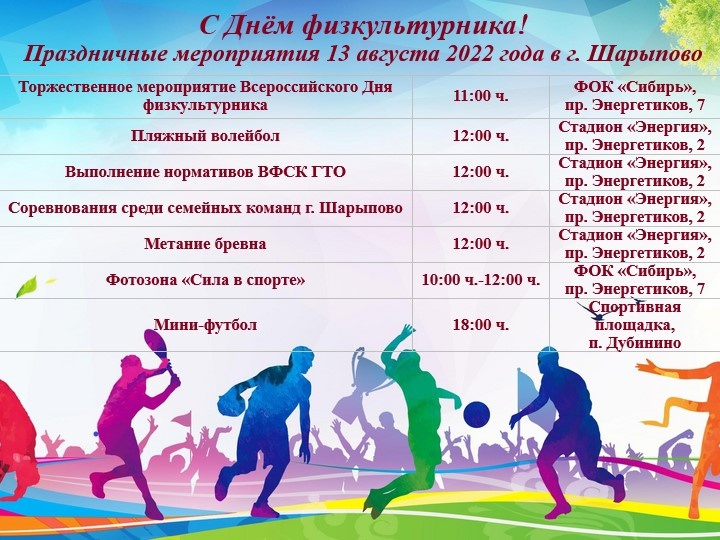 Уважаемые спортсмены, тренеры, ветераны спорта и любители физической культуры  города Шарыпово! Поздравляем вас с наступающим праздником спорта и здоровья - Днем физкультурника!