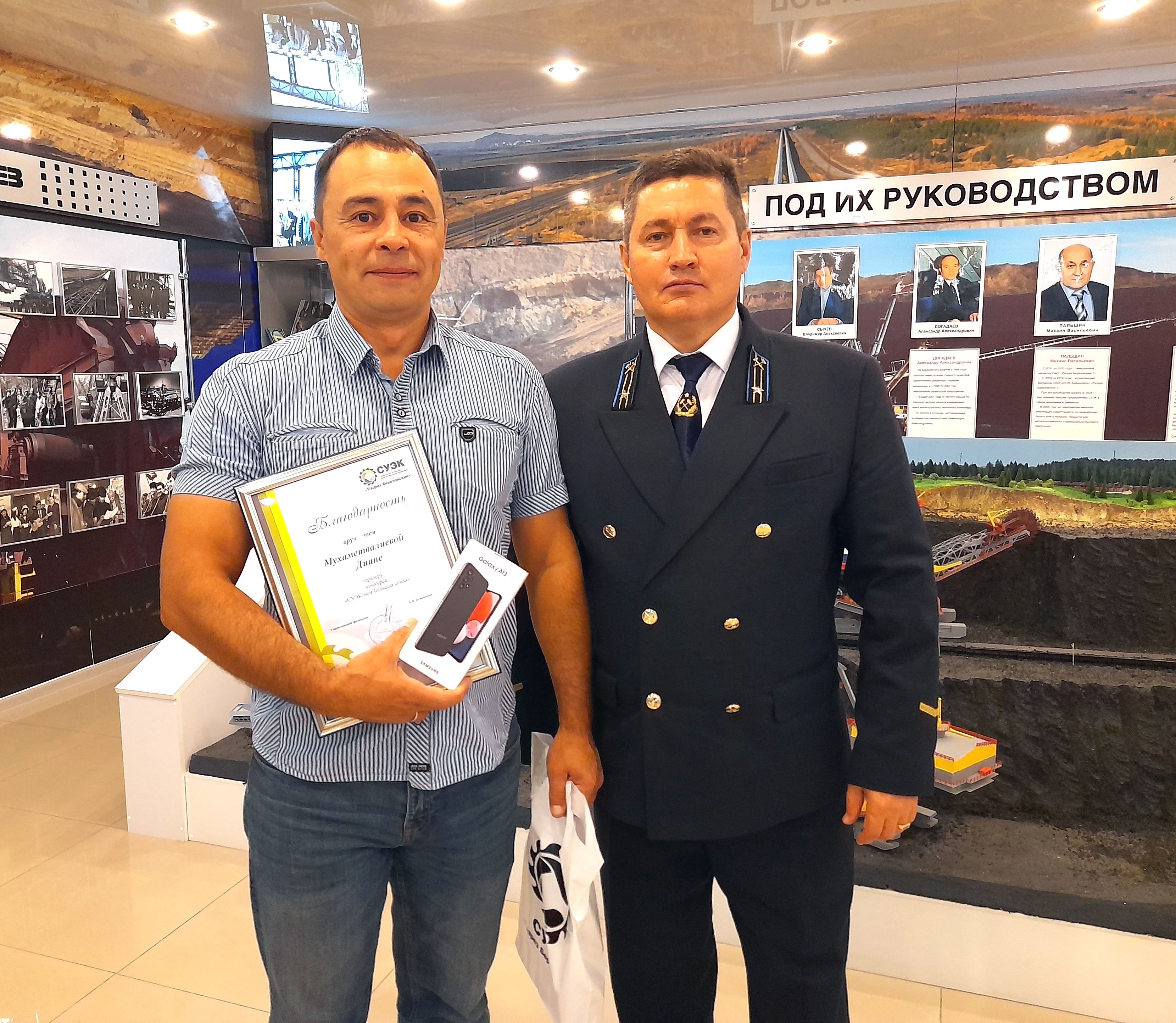 В череде важных предпраздничных событий – награждение в музее Березовского разреза победителей корпоративного творческого конкурса «СУЭК – моя большая семья», посвященного 75-летию Дня шахтёра. В этом году на Березовском разрезе четыре призера. Семье Войтовых вручили видеокамеру за прекрасный рисунок под названием «Ночная вахта». Семье Мухамедвалиевых достался сотовый телефон. По фотоаппарату получили семья Капитановых и семья Шиловых