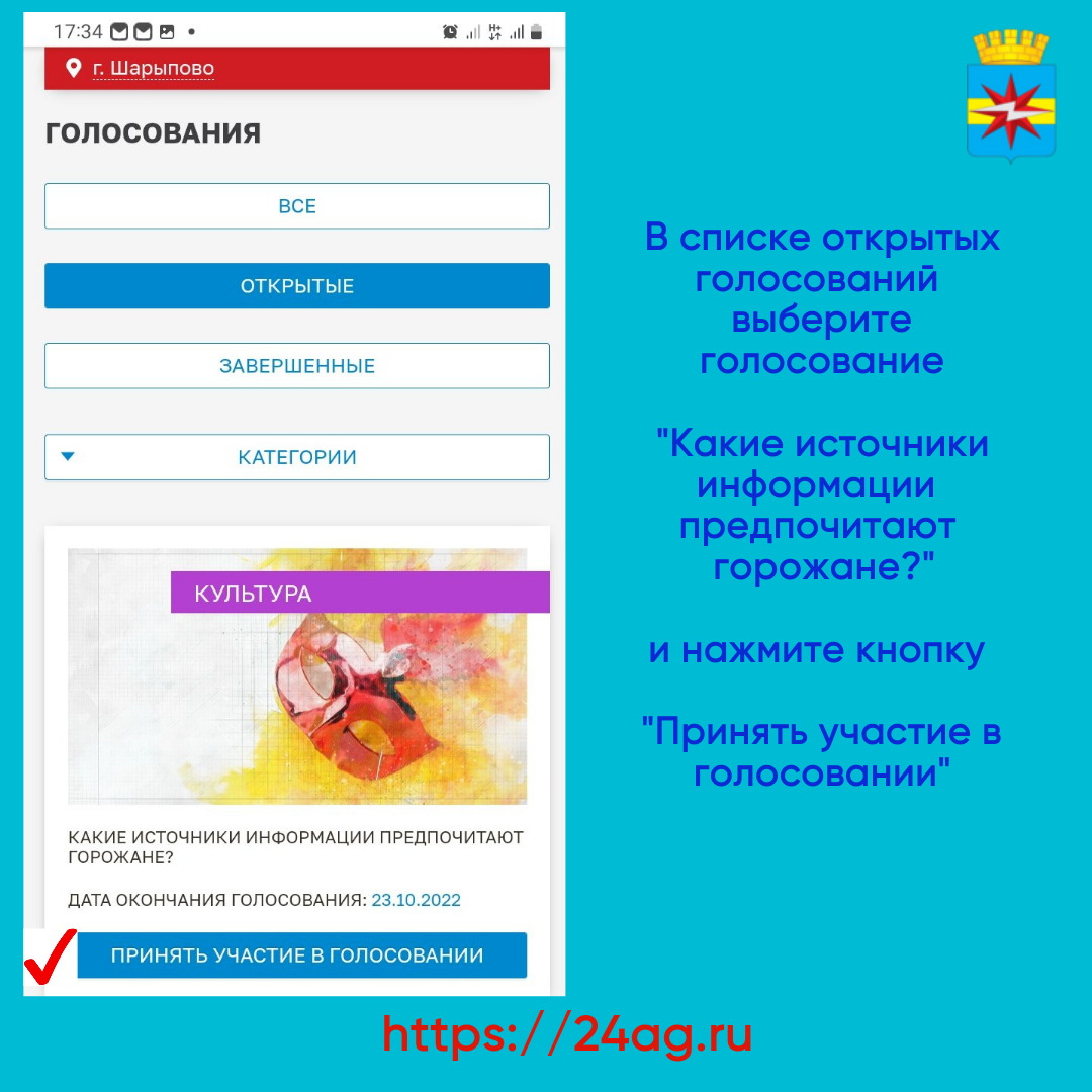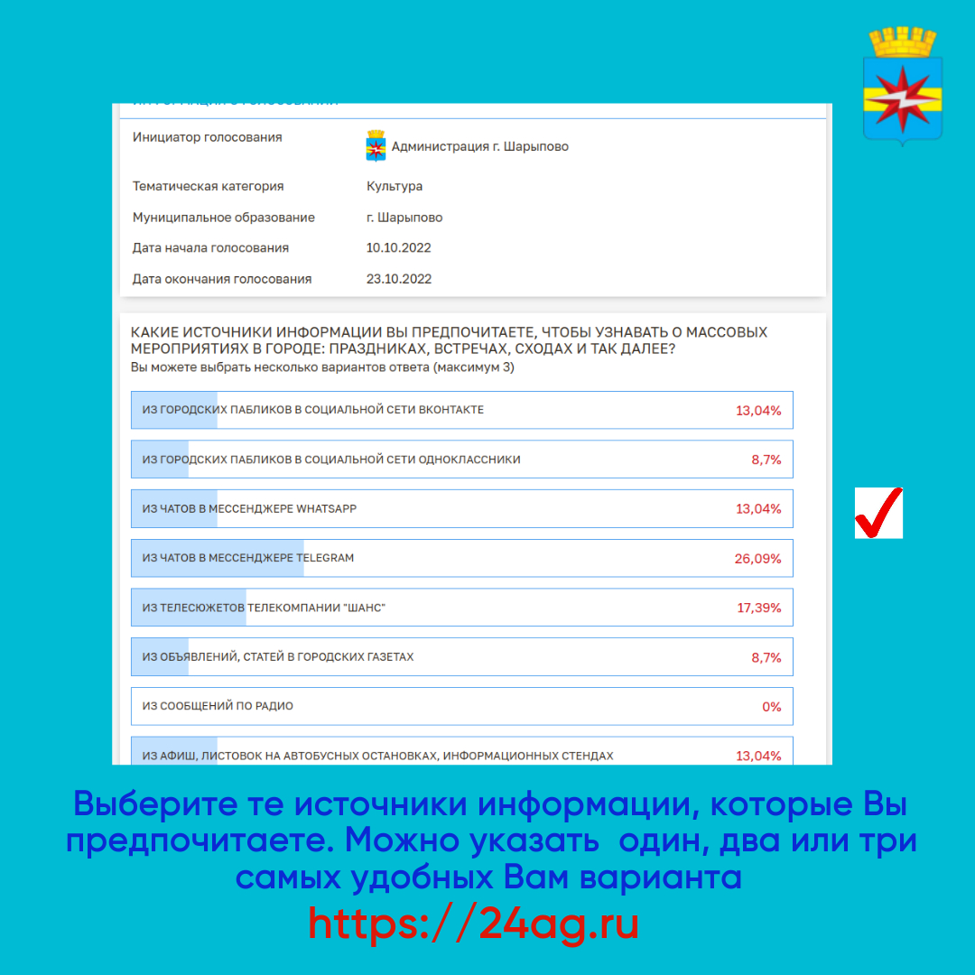 На краевом портале «Активный гражданин» https://24ag.ru до 23 октября  шарыповцев приглашают ответить на вопрос: «Какие источники информации они предпочитают, чтобы узнавать о городских массовых мероприятиях?».