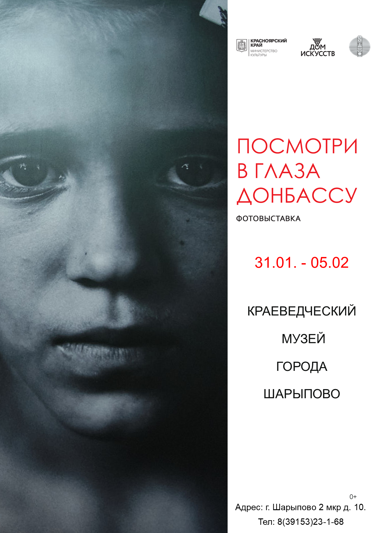 «Посмотри в глаза Донбассу» - передвижная фотовыставка, на которой представлены портреты детей, живущих в зоне боевых действий. Проект реализуется при поддержке Министерства культуры Красноярского края, по поручению Правительства Красноярского края.